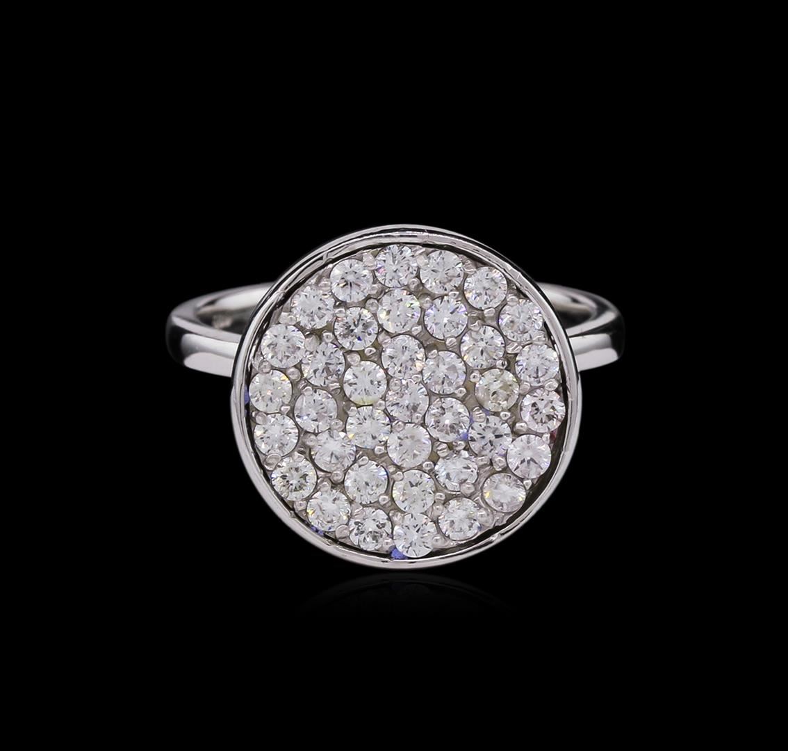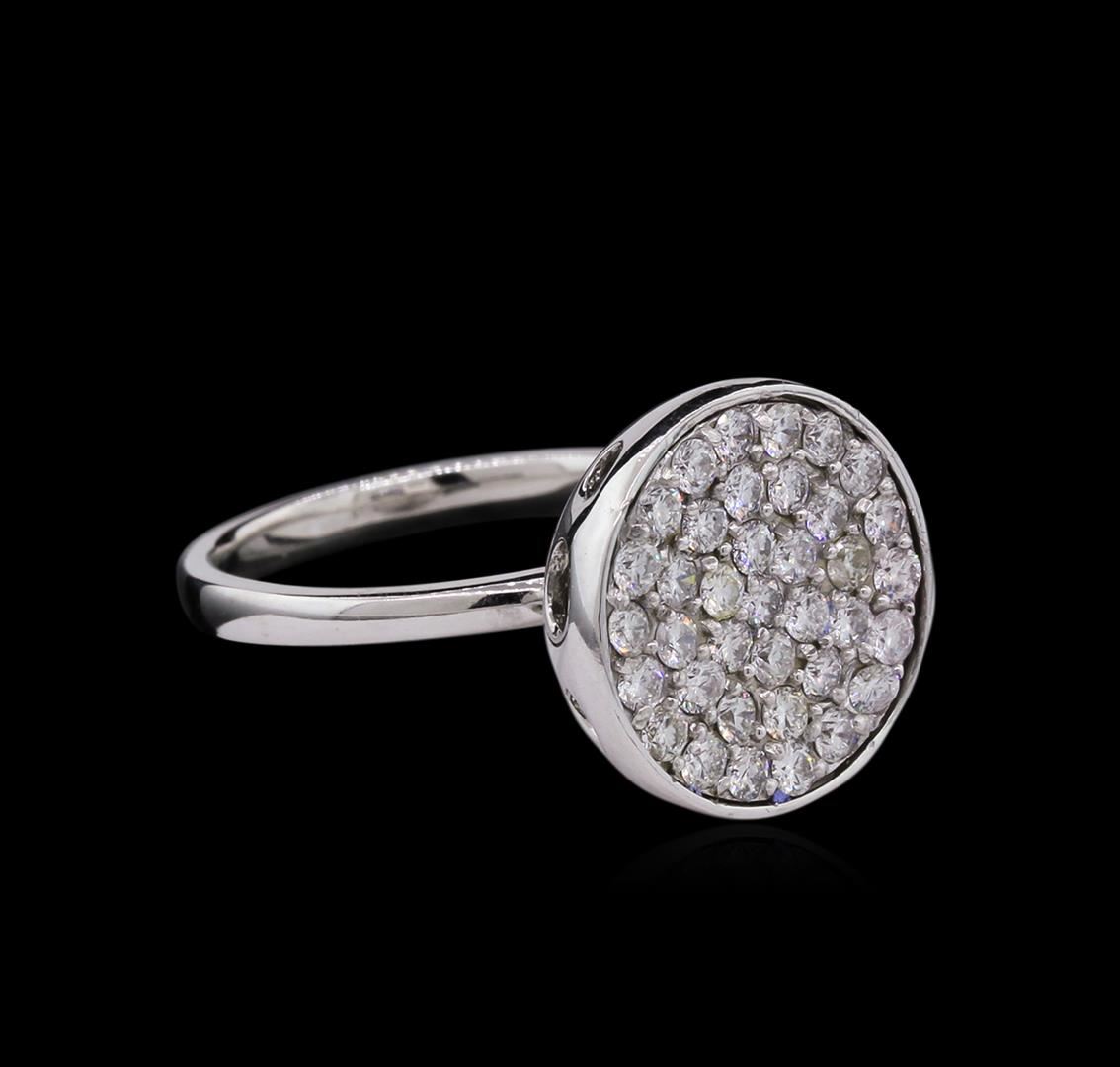 One electronically tested 14KT white gold ladies cast diamond ring with a bright polish finish. Identified with markings of "585". Condition is new. Containing: Thirty-Four prong set round brilliant cut diamonds, measuring 1.60 - 1.60 x 0.96mm (depth est.) approximate total weight of 34 Stones = 0.51ct. Clarity: SI-1 to SI-2. Color: I - J, Cut is Good. All diamonds are graded in the mounting, unless otherwise stated. Total Weight of Diamonds 0.51ct. Total Weight of Ring 5.30 grams. GGL Appraised at $2,985.00.