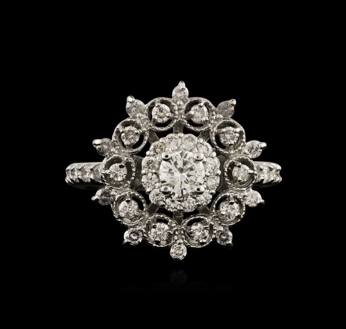 One electronically tested 14KT white gold ladies cast diamond engagement ring with a bright polish finish. Identified with markings of "14K". Condition is new. Containing: One prong set round brilliant cut diamond, measuring 4.50 - 4.50 x 2.70mm (depth est.) approximate weight of 0.33ct. Clarity: SI-2. Color: J, Cut is Good. Twenty prong set round brilliant cut diamonds, measuring 1.50 - 1.20 x 0.81mm (depth est.) approximate total weight of 20 Stones = 0.18ct. Clarity: SI-1 to I-1. Color: I - J, Cut is Good. All diamonds are graded in the mounting, unless otherwise stated. Total Weight of Diamonds 0.51ct. Total Weight of Engagement Ring 6.10 grams. GGL Appraised at $4,280.00.