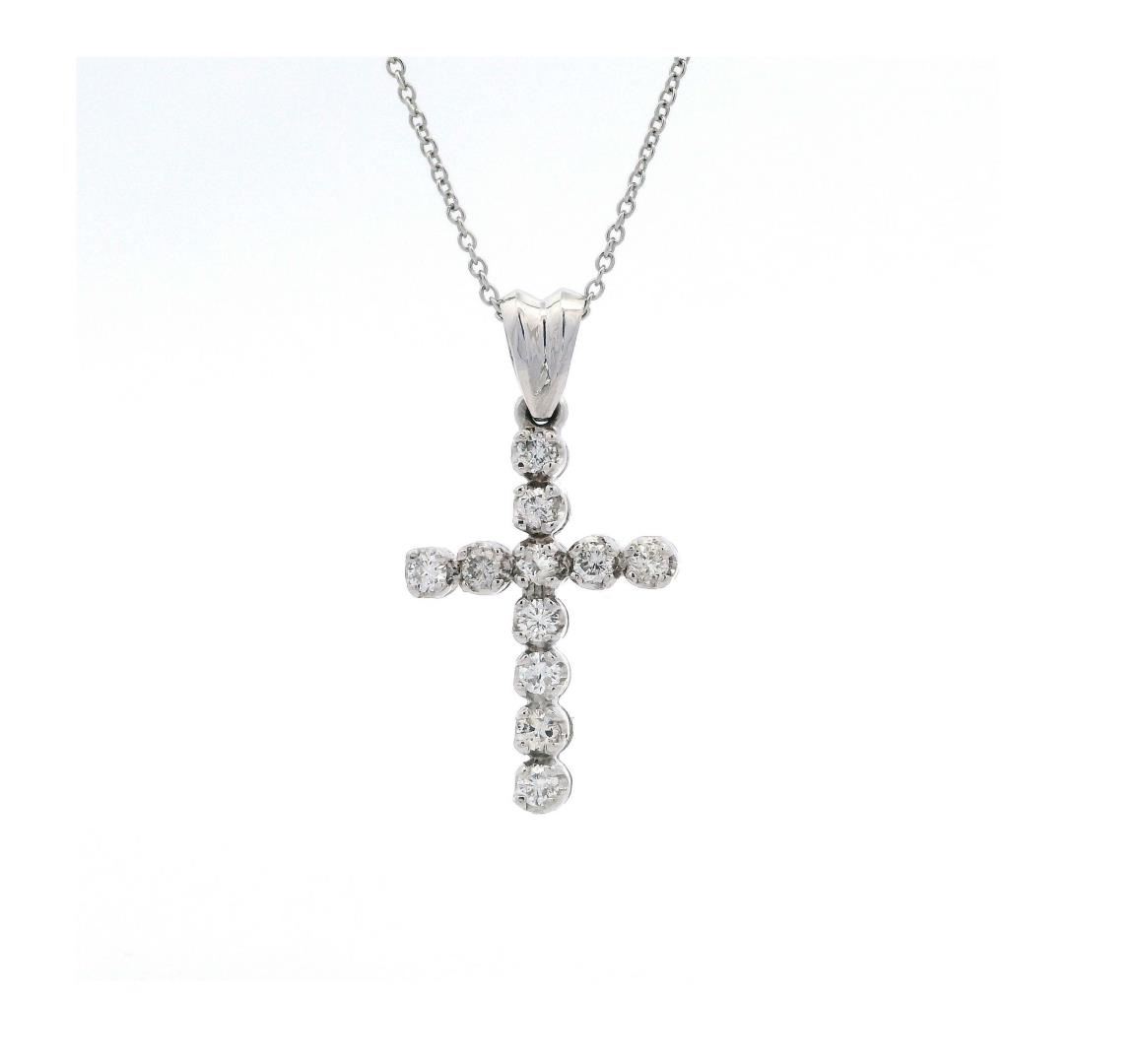 One electronically tested 14KT white gold lady's combination cast & assembled fashion cross pendant and chain 18.0" long, 1.2mm round cable link with a spring ring clasp with a bright polish finish. Condition is new, good workmanship. Identified with mark GAS Appraised.