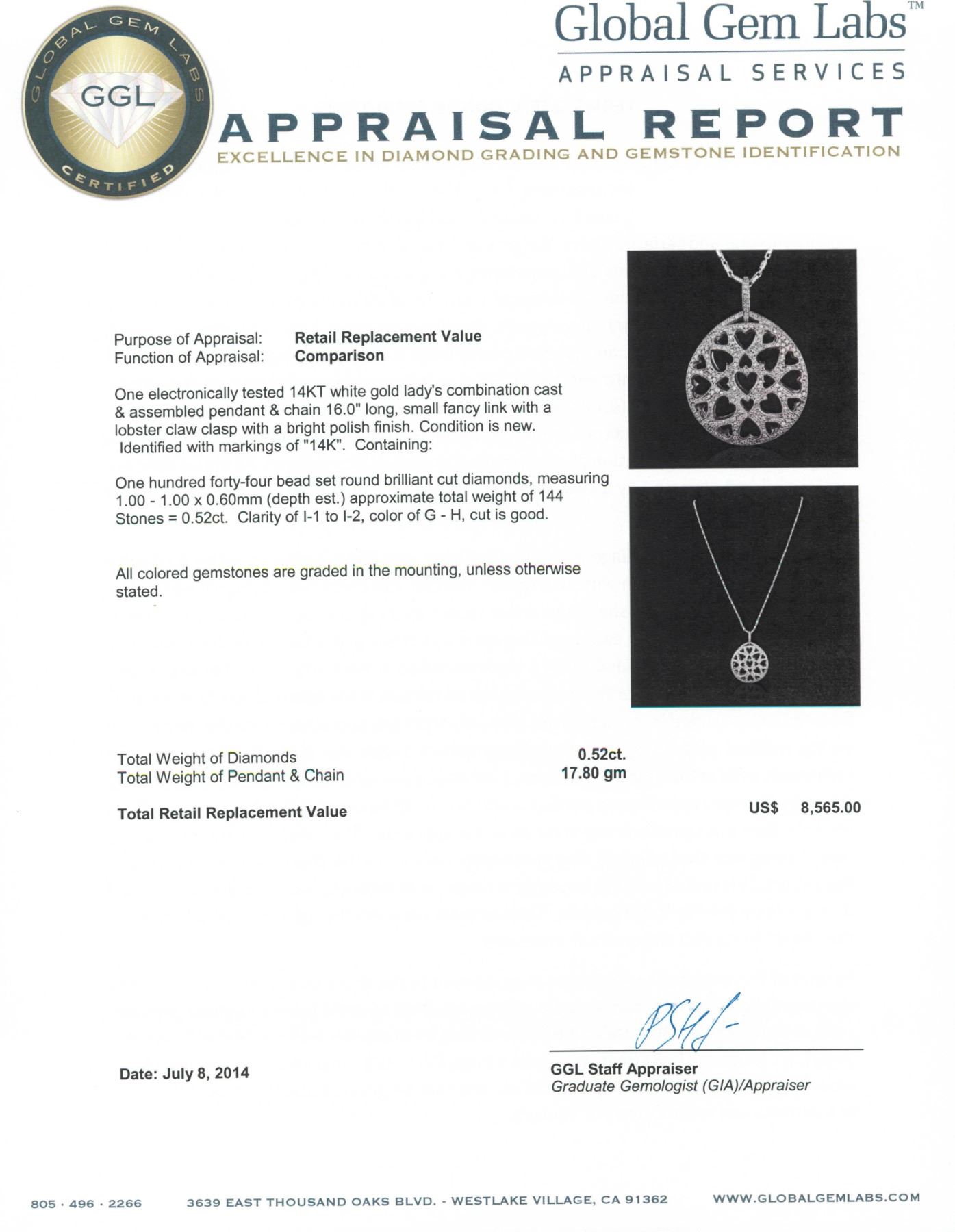 One electronically tested 14KT white gold Ladies combination cast & assembled pendant & chain 16.0" long, small fancy link with a lobster claw clasp with a bright polish finish. Condition is new. Identified with markings of "14K". Containing: One Hundred Forty-Four bead set round brilliant cut diamonds, measuring 1.00 - 1.00 x 0.60mm (depth est.) approximate. Total Weight of 144 Stones = 0.52ct. Clarity: I-1 to I-2. Color: G - H, Cut is Good. All colored gemstones are graded in the mounting, unless otherwise stated. Total Weight of Diamonds 0.52ct. Total Weight of Pendant & Chain 17.80 grams. GGL Appraised.