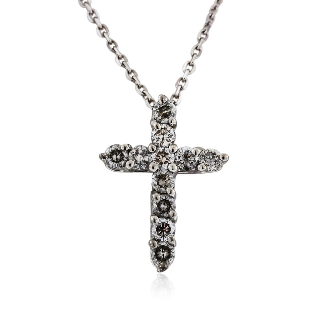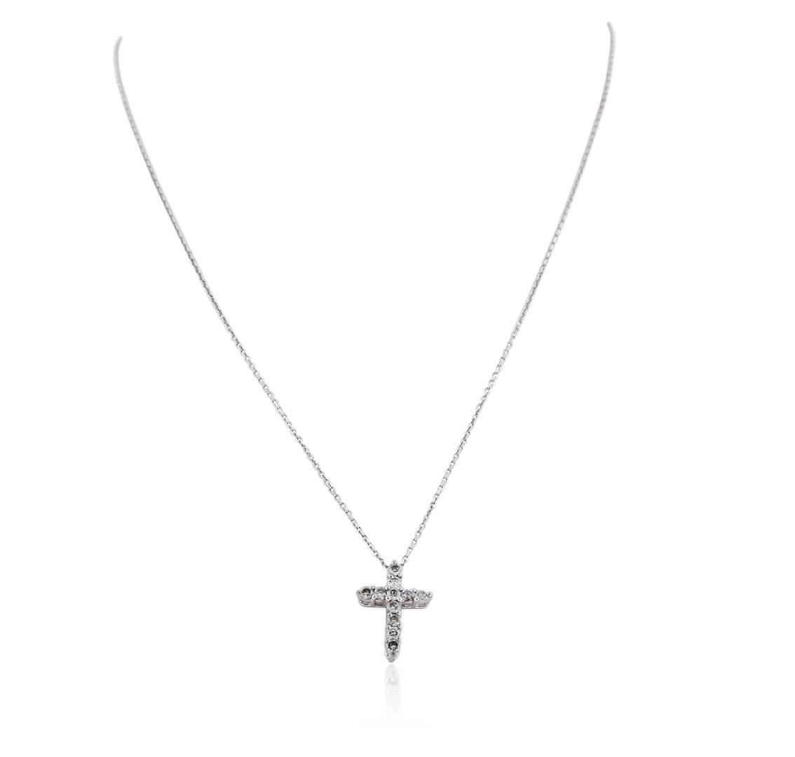 One cross pendant with chain featuring: 14KT white gold weighing 1.05 grams containing 11 prong set round diamonds with a total weight of 0.54ct.