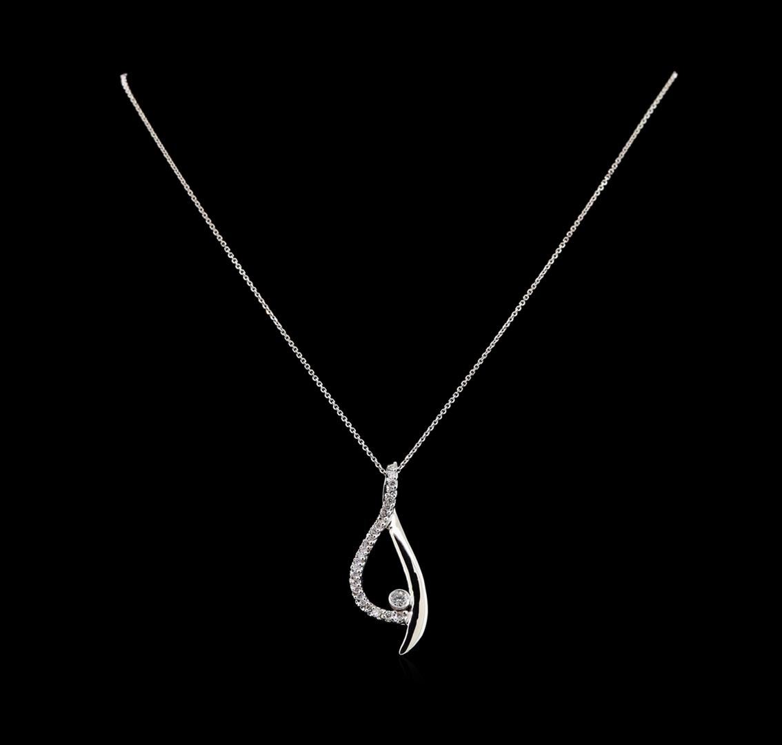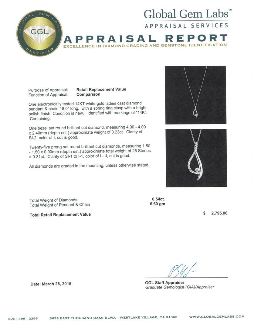 One electronically tested 14KT white gold ladies cast diamond pendant & chain 18.0" long, with a spring ring clasp with a bright polish finish. Identified with markings of "14K". Condition is new. Containing: One bezel set round brilliant cut diamond, measuring 4.00 - 4.00 x 2.40mm (depth est.) approximate weight of 0.23ct. Clarity: SI-2. Color: I, Cut is Good. Twenty-Five prong set round brilliant cut diamonds, measuring 1.50 - 1.50 x 0.90mm (depth est.) approximate total weight of 25 Stones = 0.31ct. Clarity: SI-1 to I-1. Color: I - J, Cut is Good. All diamonds are graded in the mounting, unless otherwise stated. Total Weight of Diamonds 0.54ct. Total Weight of Pendant & Chain 6.60 grams. GGL Appraised at $2,795.00.
