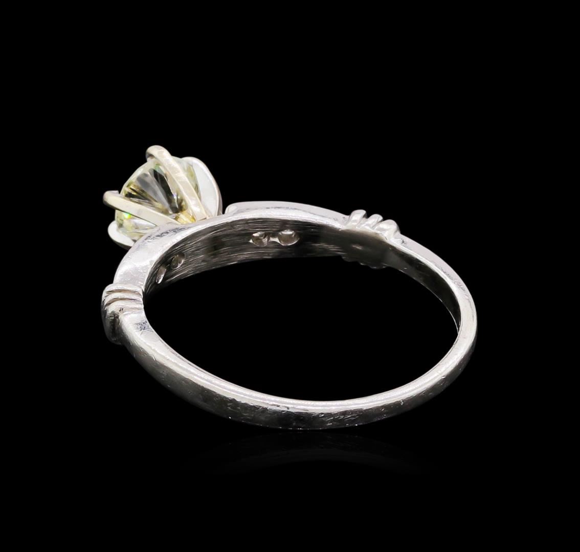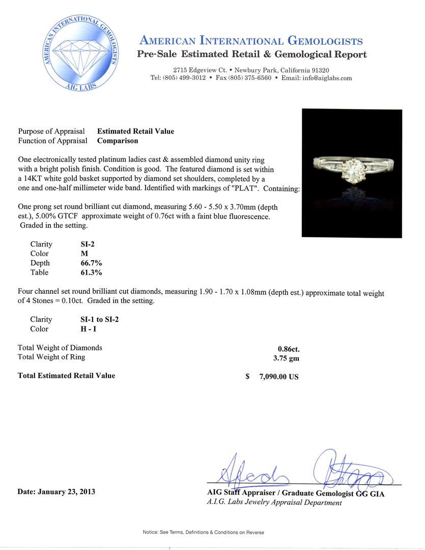 14KT White Gold 0.76ct Diamond Ring A4759 .Great Condition! YH357FB. One electronically tested platinum ladies cast & assembled diamond unity ring with a bright polish finish. Condition is good. The featured diamond is set within a 14KT white gold basket supported by diamond set shoulders, completed by a one and one-half millimeter wide band. Identified with markings of "PLAT". Containing: One prong set round brilliant cut diamonds, measuring 5.60 - 5.50 x 3.70mm (depth est.), 5.00%GTCF approximate weight of 0.76ct with a faint blue fluorescence. Graded in the setting. Clarity SI-2. Color M. Depth 66.7%. Table 61.3%. Four channel set round brilliant cut diamonds, measuring 1.90 - 1.70 x 1.08mm (depth est.) approximate total weight of 4 stones = 0.10ct. Graded in the setting. Clarity SI-1 to SI-2. Color H-I. Total weight of Diamonds 0.86ct. Total weight of Ring 3.75gm. AIG Appraised at $7,090.00.