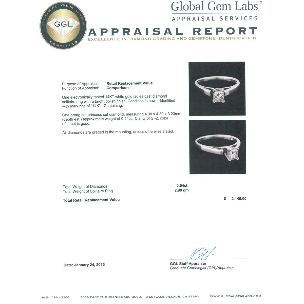One electronically tested 14KT white gold ladies cast diamond solitaire ring with a bright polish finish. Identified with markings of "14K". Condition is new. Containing: One prong set princess cut diamond, measuring 4.30 x 4.30 x 3.23mm (depth est.) approximate weight of 0.54ct. Clarity: SI-2. Color: J, Cut is Good. All diamonds are graded in the mounting, unless otherwise stated. Total Weight of Diamonds 0.54ct. Total Weight of Solitaire Ring 2.90 grams. GGL Appraised at $2,145.00.