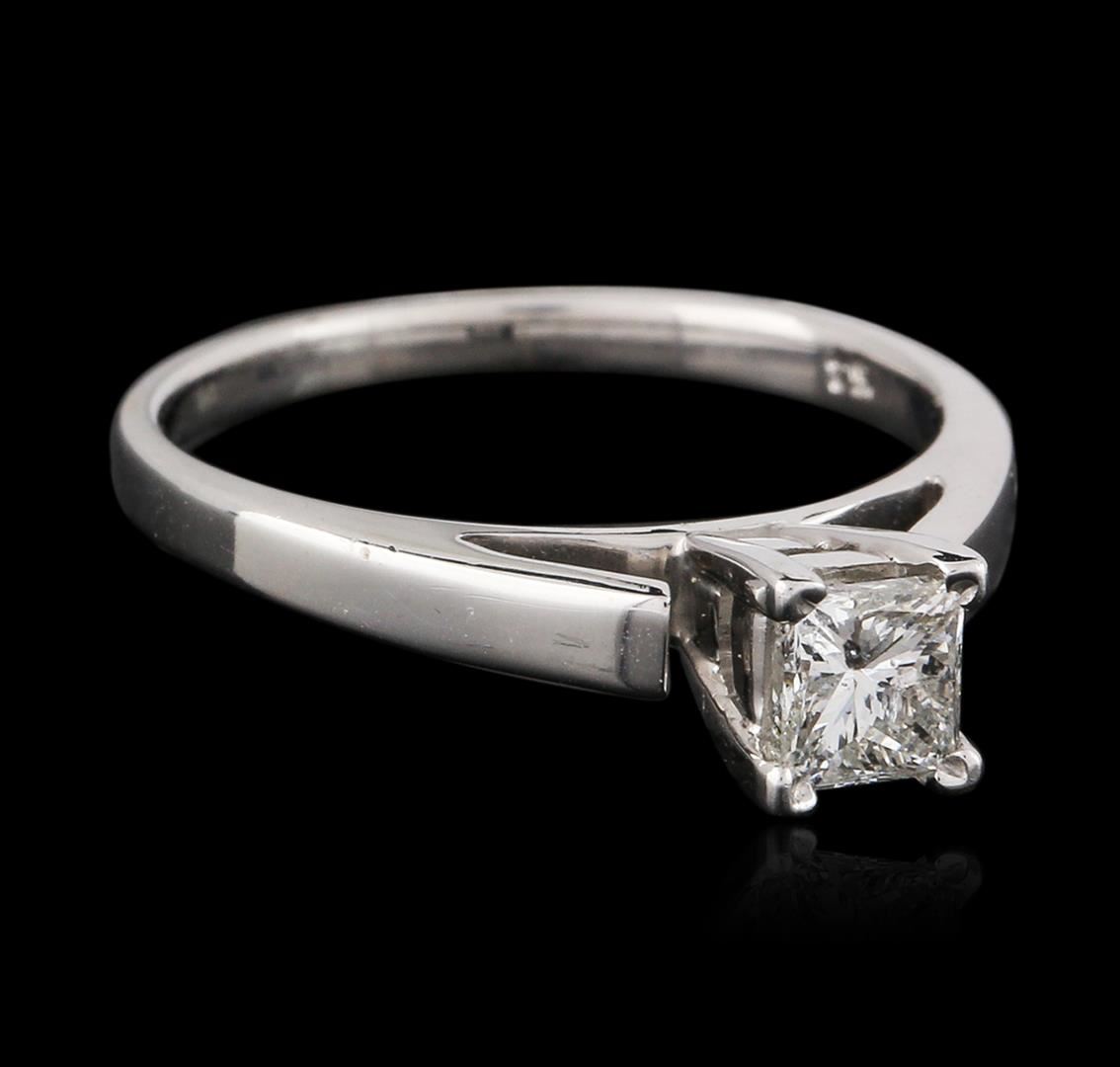 One electronically tested 14KT white gold ladies cast diamond solitaire ring with a bright polish finish. Identified with markings of "14K". Condition is new. Containing: One prong set princess cut diamond, measuring 4.30 x 4.30 x 3.23mm (depth est.) approximate weight of 0.54ct. Clarity: SI-2. Color: J, Cut is Good. All diamonds are graded in the mounting, unless otherwise stated. Total Weight of Diamonds 0.54ct. Total Weight of Solitaire Ring 2.90 grams. GGL Appraised at $2,145.00.