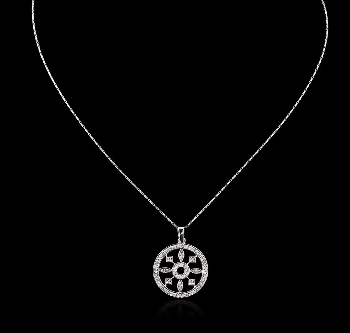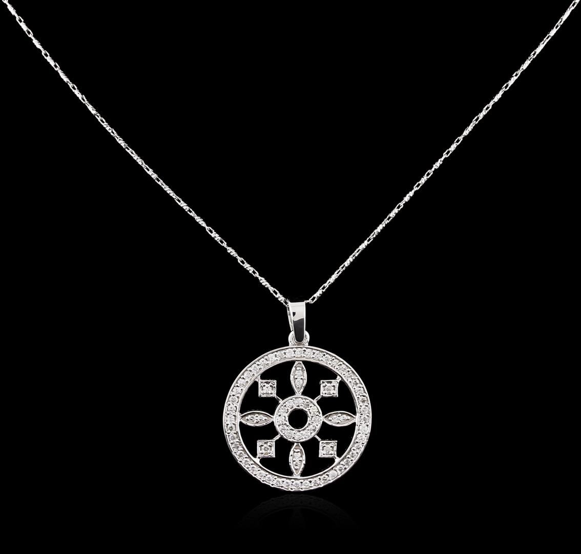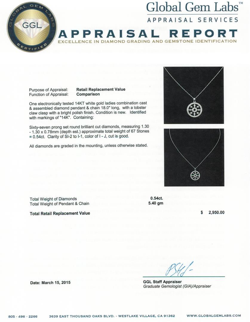 One electronically tested 14KT white gold ladies combination cast & assembled diamond pendant & chain 18.0" long, with a lobster claw clasp with a bright polish finish. Identified with markings of "14K". Condition is new. Containing: Sixty-Seven prong set round brilliant cut diamonds, measuring 1.30 - 1.30 x 0.78mm (depth est.) approximate total weight of 67 Stones = 0.54ct. Clarity of SI-2 to I-1, Color of I - J, Cut is Good. All diamonds are graded in the mounting, unless otherwise stated. Total Weight of Diamonds 0.54ct. Total Weight of Pendant & Chain 5.40 grams. GGL Appraised at $2,950.00.