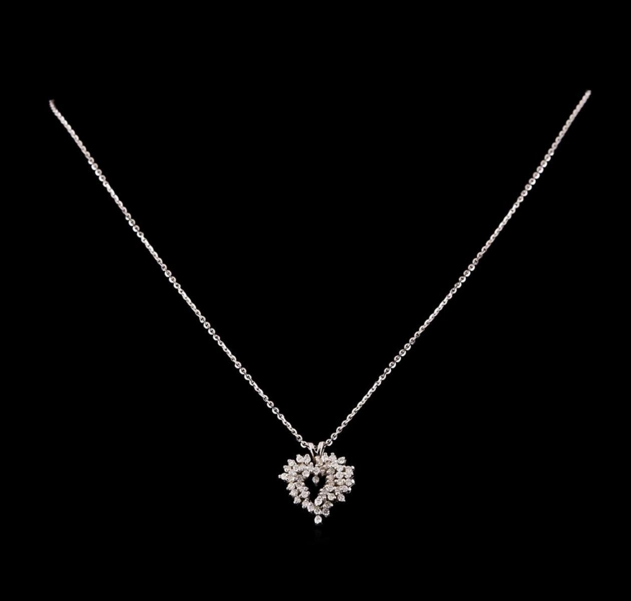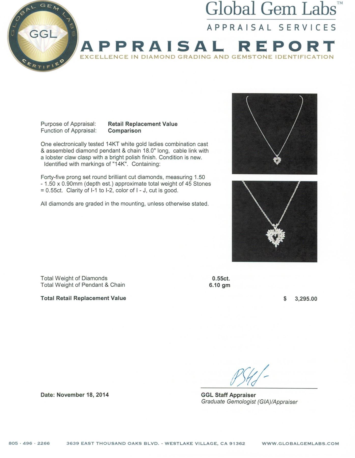 One electronically tested 14KT white gold ladies combination cast & assembled diamond pendant & chain 18.0" long, cable link with a lobster claw clasp with a bright polish finish. Identified with markings of "14K". Condition is new. Containing: Forty-Five prong set round brilliant cut diamonds, measuring 1.50 - 1.50 x 0.90mm (depth est.) approximate total weight of 45 Stones = 0.55ct. Clarity: I-1 to I-2. Color: I - J, Cut is Good. All diamonds are graded in the mounting, unless otherwise stated. Total Weight of Diamonds 0.55ct. Total Weight of Pendant & Chain 6.10 grams. GGL Appraised.