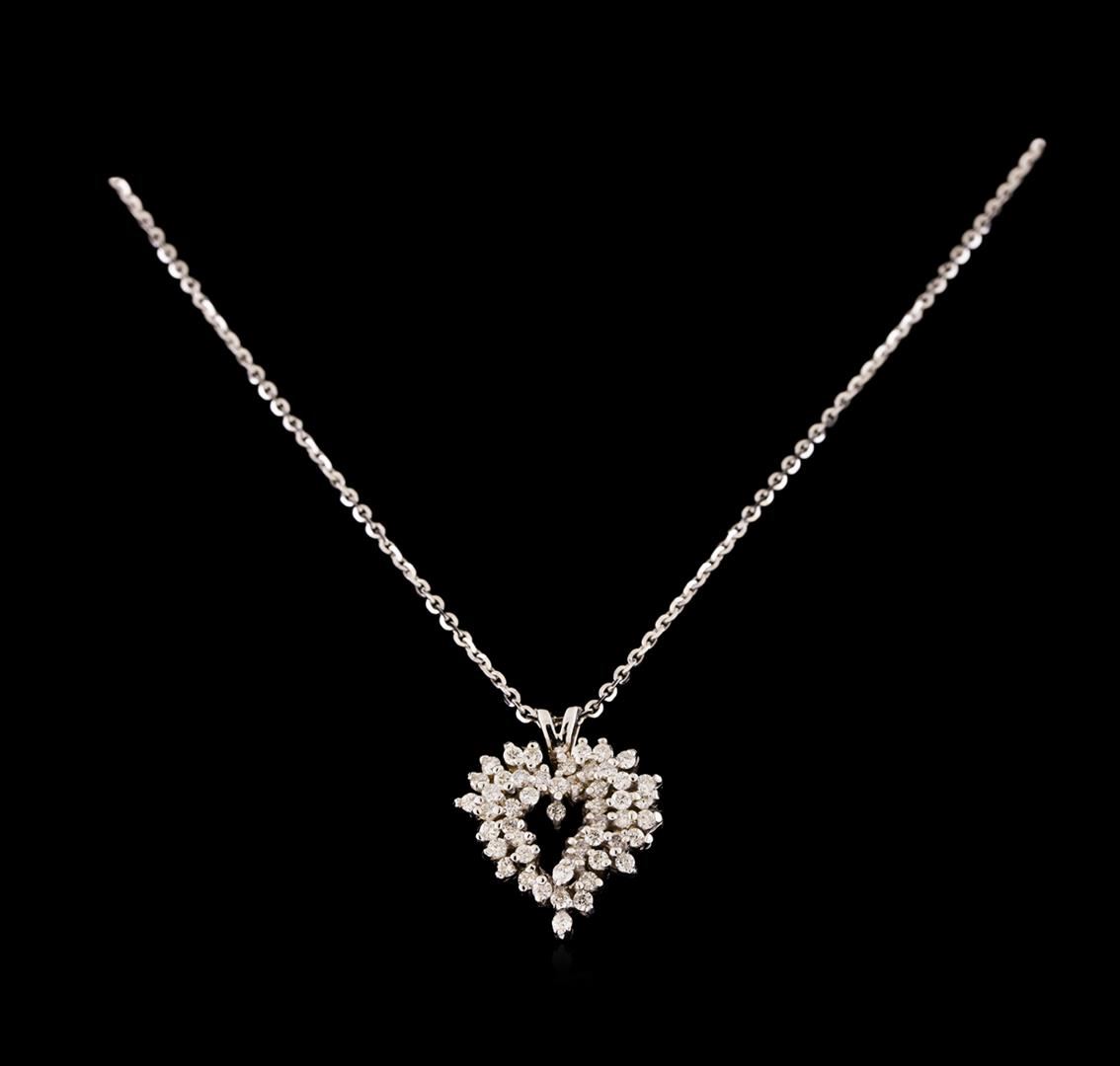 One electronically tested 14KT white gold ladies combination cast & assembled diamond pendant & chain 18.0" long, cable link with a lobster claw clasp with a bright polish finish. Identified with markings of "14K". Condition is new. Containing: Forty-Five prong set round brilliant cut diamonds, measuring 1.50 - 1.50 x 0.90mm (depth est.) approximate total weight of 45 Stones = 0.55ct. Clarity: I-1 to I-2. Color: I - J, Cut is Good. All diamonds are graded in the mounting, unless otherwise stated. Total Weight of Diamonds 0.55ct. Total Weight of Pendant & Chain 6.10 grams. GGL Appraised.