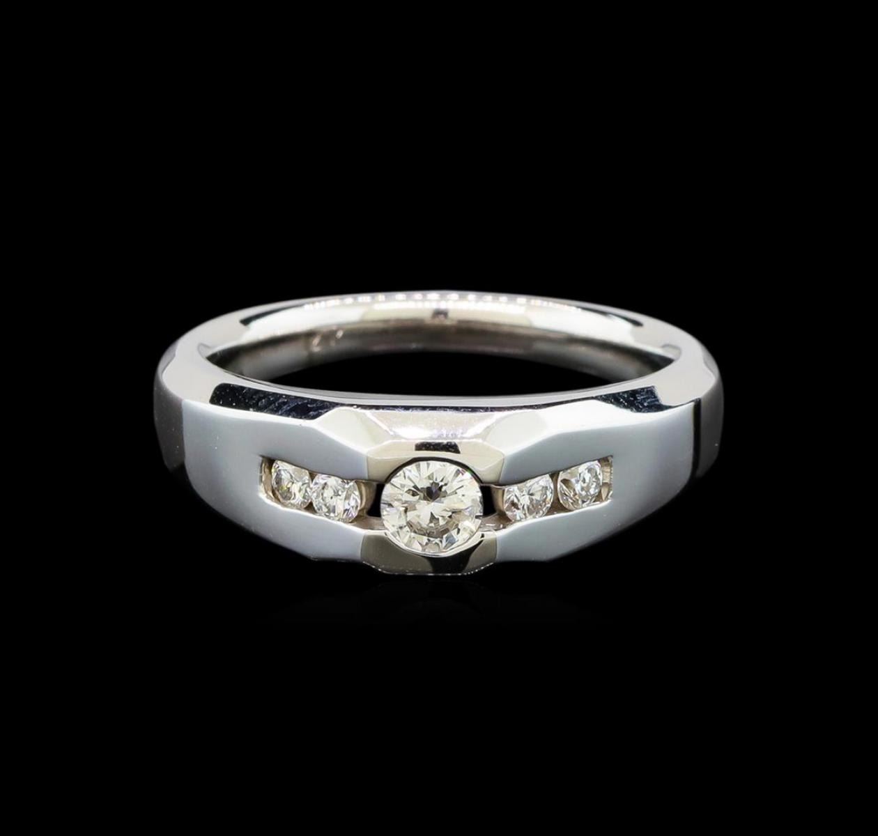 One electronically tested 14KT white gold gents cast diamond ring with a bright polish finish. The featured diamond is supported by diamond set shoulders, completed by a two and one-half millimeter wide band. Identified with markings of "14K". Condition is new, good workmanship. Containing: One channel set round brilliant cut diamond, measuring 4.41 - 4.40 x 2.20mm (depth est.) approximate weight of 0.30ct with a medium strong blue fluorescence. Graded in the setting. Clarity: I-1. Color: H. Depth 49.9%. Table 61.2%. Four channel set round brilliant cut diamonds, measuring 2.40 - 2.30 x 1.41mm (depth est.) approximate total weight of 4 Stones = 0.25ct. Graded in the setting. Clarity: SI-2 to I-1. Color: G - H. Total Weight of Diamonds 0.55ct. Total Weight of Ring 7.62 grams. AIG Appraised.
