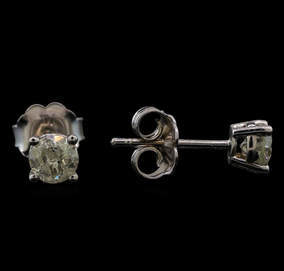 One pair electronically tested 14KT white gold ladies cast diamond stud earrings with friction posts with a bright polish finish. Identified with markings of "14K". Condition is new. Containing: Two prong set round brilliant cut diamonds, measuring 4.20 - 4.20 x 2.54mm (depth est.) approximate total weight of 2 Stones = 0.55ct. Clarity: I-3 to I-3. Color: K, Cut is Good. Diamonds are graded in the mounting, unless otherwise stated. Total Weight of Diamonds 0.55ct. Total Weight of Stud Earrings 0.70 grams. GGL Appraised at $725.00.