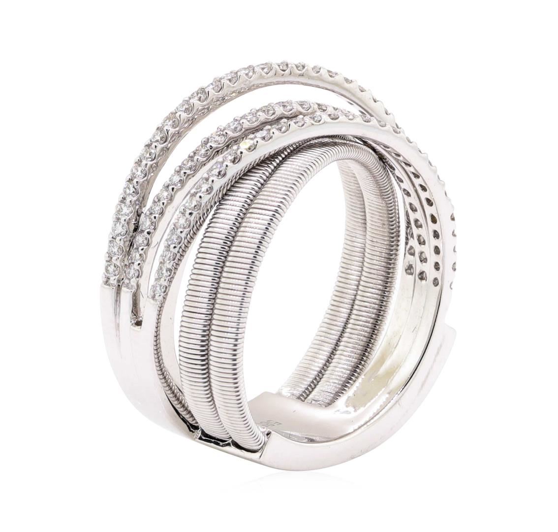 One electronically tested 14KT white gold Ladies combination cast & assembled fashion band with a five row crossover split shank with a bright polish finish. The featured ladies ring has a shank measuring 9 millimeters in width. Identified with markings of '585'. Condition is new, good workmanship. Containing: Ninety prong set round brilliant cut diamonds, measuring 1.25 - 1.15 x 0.74mm (depth est.) approximate total weight of 90 Stones = 0.57ct. Graded in the setting. Color H - I Clarity VS-2 to SI-1 Cut Very Good. Total Weight of Diamonds 0.57ct.. Total Weight of Band 7.40gm. GAS Appraised.