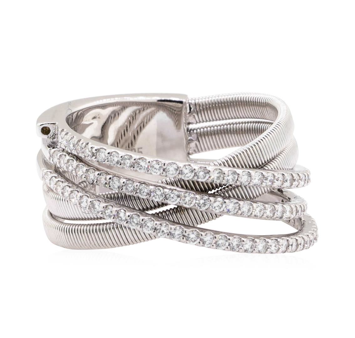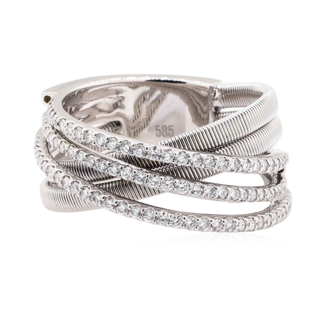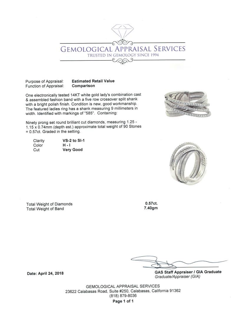 One electronically tested 14KT white gold Ladies combination cast & assembled fashion band with a five row crossover split shank with a bright polish finish. The featured ladies ring has a shank measuring 9 millimeters in width. Identified with markings of '585'. Condition is new, good workmanship. Containing: Ninety prong set round brilliant cut diamonds, measuring 1.25 - 1.15 x 0.74mm (depth est.) approximate total weight of 90 Stones = 0.57ct. Graded in the setting. Color H - I Clarity VS-2 to SI-1 Cut Very Good. Total Weight of Diamonds 0.57ct.. Total Weight of Band 7.40gm. GAS Appraised.