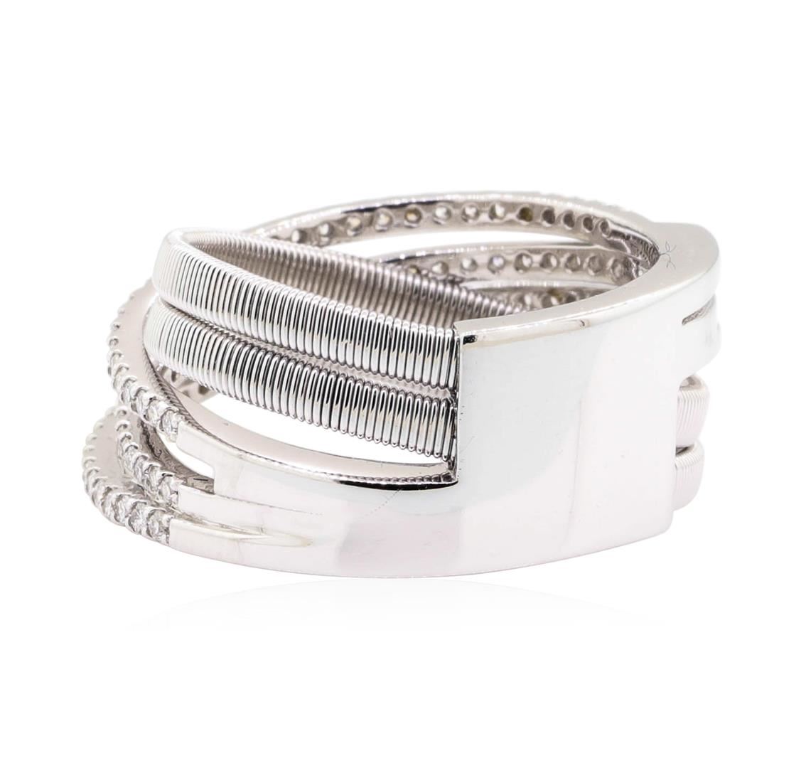 One electronically tested 14KT white gold Ladies combination cast & assembled fashion band with a five row crossover split shank with a bright polish finish. The featured ladies ring has a shank measuring 9 millimeters in width. Identified with markings of '585'. Condition is new, good workmanship. Containing: Ninety prong set round brilliant cut diamonds, measuring 1.25 - 1.15 x 0.74mm (depth est.) approximate total weight of 90 Stones = 0.57ct. Graded in the setting. Color H - I Clarity VS-2 to SI-1 Cut Very Good. Total Weight of Diamonds 0.57ct.. Total Weight of Band 7.40gm. GAS Appraised.