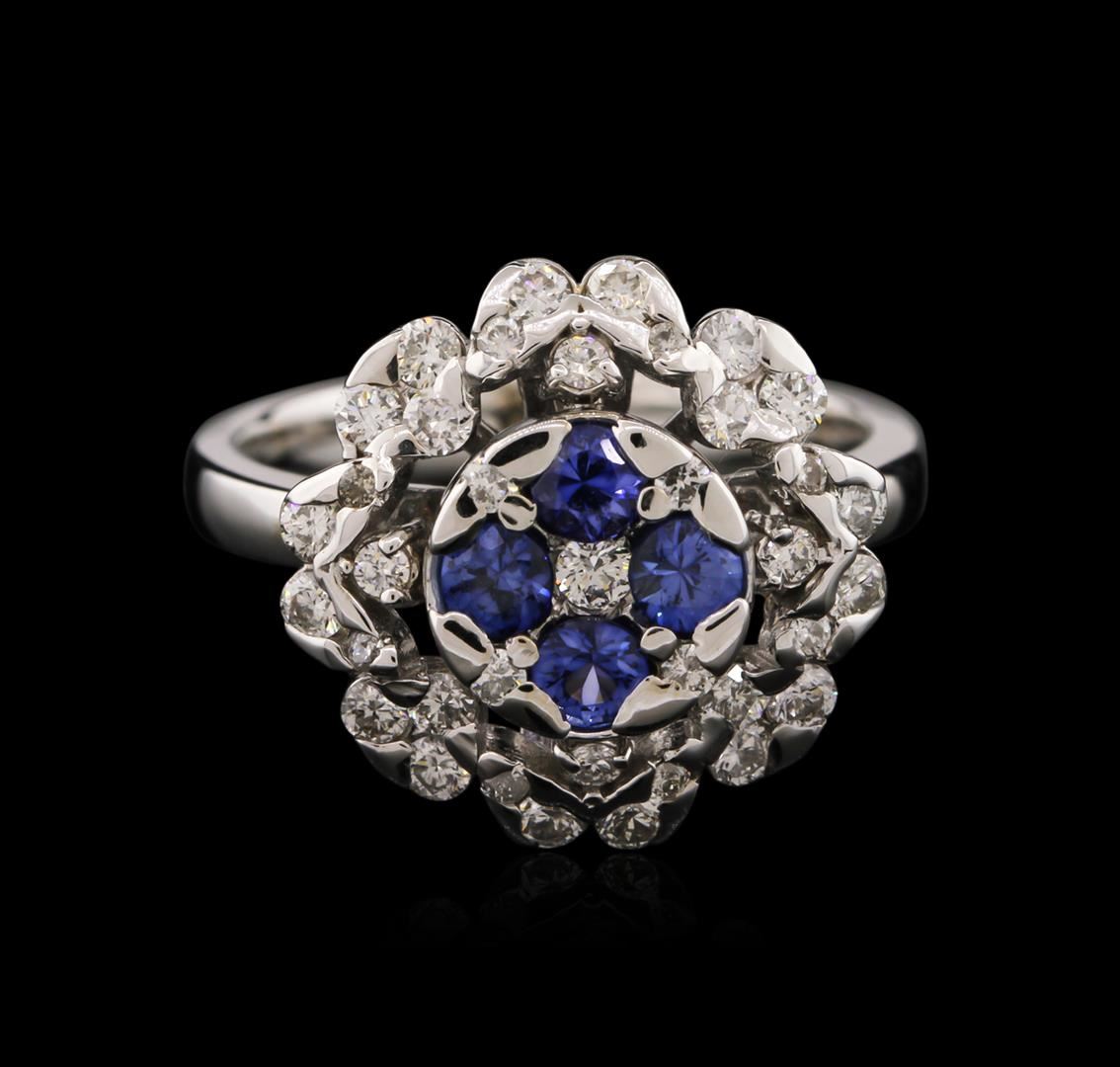One electronically tested 14KT white gold ladies cast tanzanite and diamond ring with a bright polish finish. Identified with markings of "14K". Condition is new. Containing: Four prong set round modified brilliant cut natural tanzanites, measuring 3.00 - 3.00 x 1.95 mm, approximate total weight of 0.58ct., clarity is eye clean, type I, medium, moderately strong, blue color, (GIA B 5/4), cut is good. Thirty-Seven prong set round brilliant cut diamonds, measuring 1.80 - 1.30 x 0.93mm (depth est.) approximate total weight of 37 Stones = 0.67ct. Clarity: SI-1 to SI-2. Color: H - I, Cut is Good. Colored gemstones are presumed to have been subjected to commonly used enhancement processes. All diamonds and colored gemstones are graded in the mounting, unless otherwise stated. Total Weight of Colored Stones 0.58ct. Total Weight of Diamonds 0.67ct. Total Weight of Ring 5.70 grams. GGL Appraised.