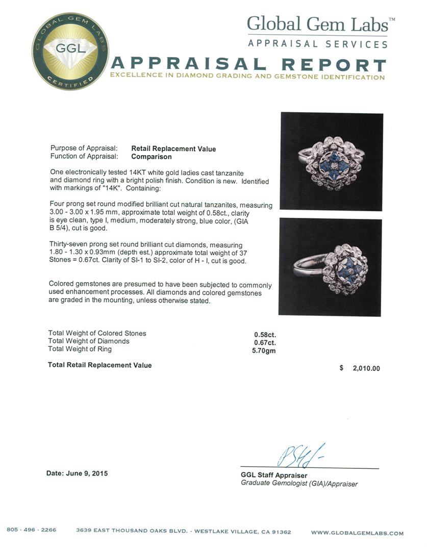 One electronically tested 14KT white gold ladies cast tanzanite and diamond ring with a bright polish finish. Identified with markings of "14K". Condition is new. Containing: Four prong set round modified brilliant cut natural tanzanites, measuring 3.00 - 3.00 x 1.95 mm, approximate total weight of 0.58ct., clarity is eye clean, type I, medium, moderately strong, blue color, (GIA B 5/4), cut is good. Thirty-Seven prong set round brilliant cut diamonds, measuring 1.80 - 1.30 x 0.93mm (depth est.) approximate total weight of 37 Stones = 0.67ct. Clarity: SI-1 to SI-2. Color: H - I, Cut is Good. Colored gemstones are presumed to have been subjected to commonly used enhancement processes. All diamonds and colored gemstones are graded in the mounting, unless otherwise stated. Total Weight of Colored Stones 0.58ct. Total Weight of Diamonds 0.67ct. Total Weight of Ring 5.70 grams.