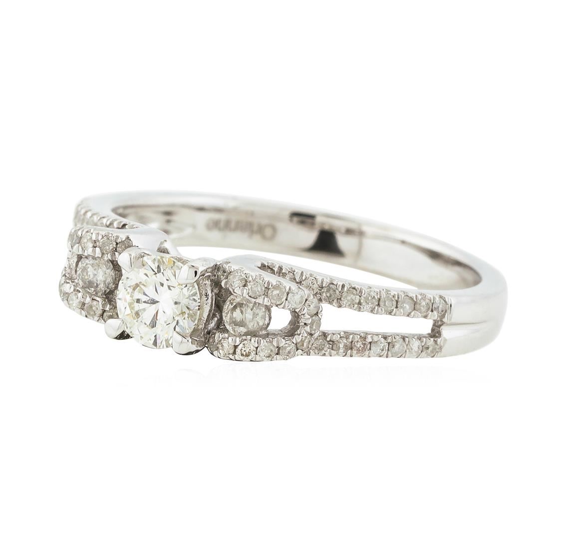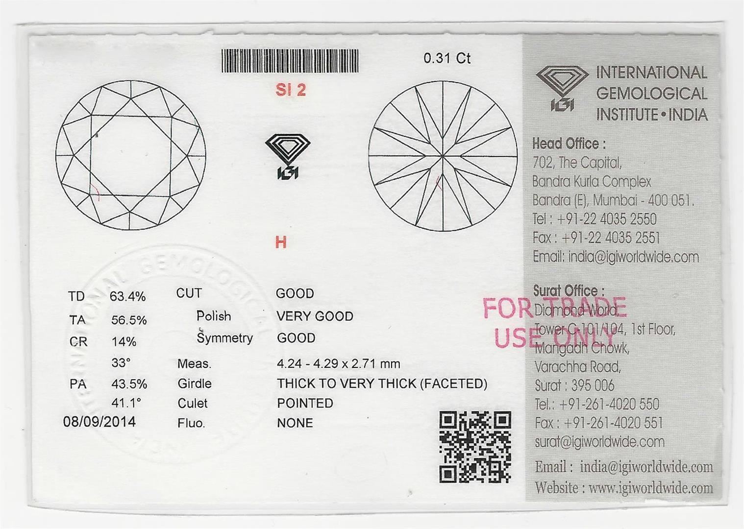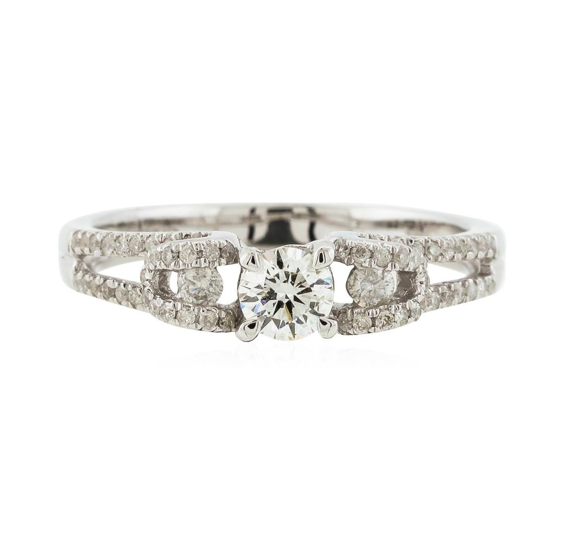 One 14KT White Gold 0.59ctw Diamond Ring with a total weight of 3 grams. The center diamond has a weight of 0.31cts with a color of (H) and a clarity of SI-2. Total weight of side diamonds is 0.28cts. IGI Appraised.