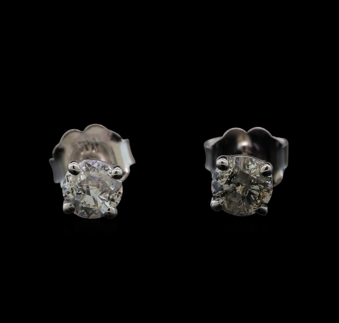 One pair electronically tested 14KT white gold ladies cast diamond stud earrings with friction posts with a bright polish finish. Identified with markings of "14K". Condition is new. Containing: Two prong set round brilliant cut diamonds, measuring 4.30 - 4.30 x 2.60mm (depth est.) approximate total weight of 2 Stones = 0.59ct. Clarity: I-3 to I-3. Color: K, Cut is Good. Diamonds are graded in the mounting, unless otherwise stated. Total Weight of Diamonds 0.59ct. Total Weight of Stud Earrings 0.80 grams. GGL Appraised at $870.00.