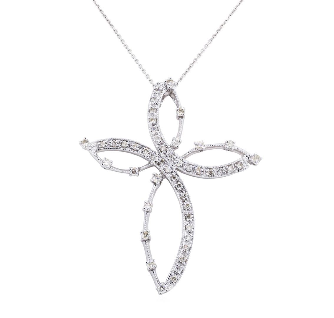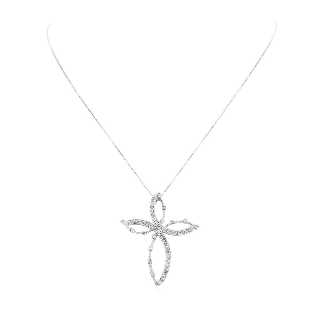 One cross pendant with an attached sixteen inch chain featuring: 14KT white gold weighing 6.0 grams containing diamonds weighing 0.60ctw.