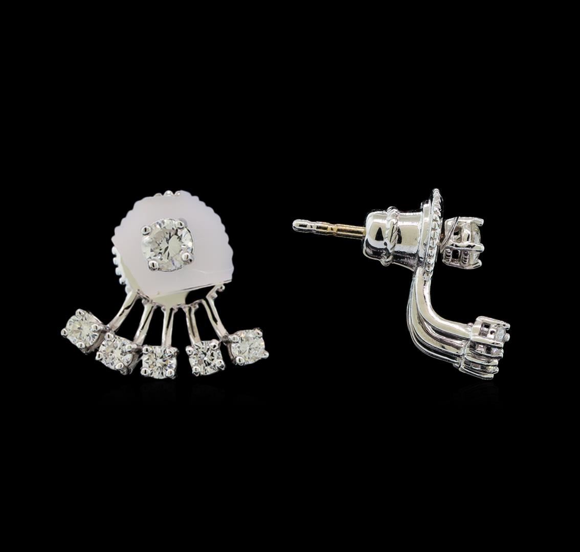 One pair electronically tested 14KT white gold ladies cast diamond earrings with a bright polish finish. Identified with markings of "14K". Condition is new. Containing: Two prong set round brilliant cut diamonds, measuring 3.00 - 3.00 x 1.80mm (depth est.) approximate total weight of 2 Stones = 0.23ct. Clarity: SI-1 to SI-2. Color: I - J, Cut is Good. Ten prong set round brilliant cut diamonds, measuring 2.00 - 2.00 x 1.20mm (depth est.) approximate total weight of 10 Stones = 0.37ct. Clarity: SI-1 to SI-2. Color: I - J, Cut is Good. All diamonds are graded in the mounting, unless otherwise stated. Total Weight of Diamonds 0.60ct. Total Weight of Earrings 4.00 grams. GGL Appraised at $2,020.00.