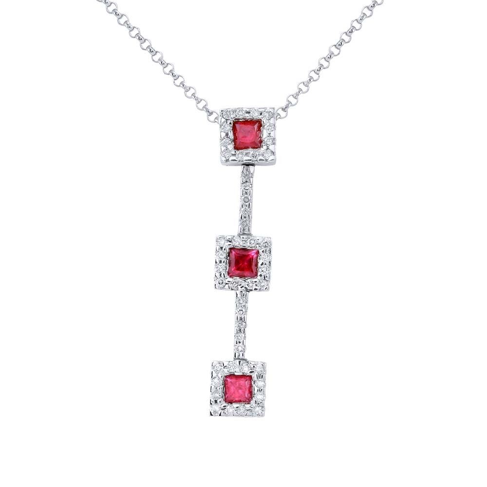 One 14KT White Gold 0.60ctw Ruby and Diamond Pendant with Chain. (3) Rubies with a total weight of 0.60cts. (46) Diamonds with a total weight of 0.30cts with a color of I and clarity of SI-1 to SI-2. Total weight of this pendant with chain is 3.95 grams.