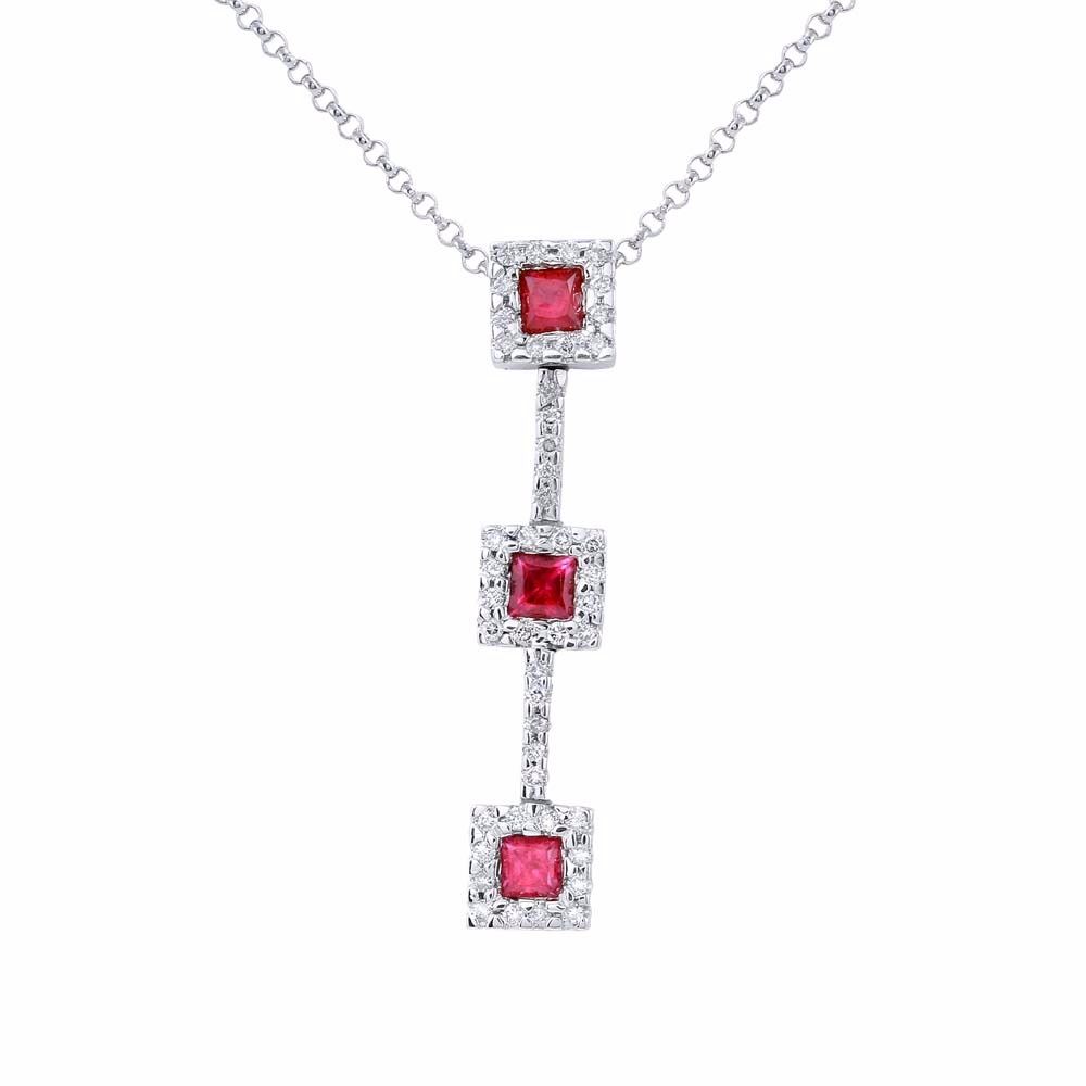 One 14KT White Gold 0.60ctw Ruby and Diamond Pendant with Chain. (3) Rubies with a total weight of 0.60cts. (46) Diamonds with a total weight of 0.30cts with a color of I and clarity of SI-1 to SI-2. Total weight of this pendant with chain is 3.95 grams.