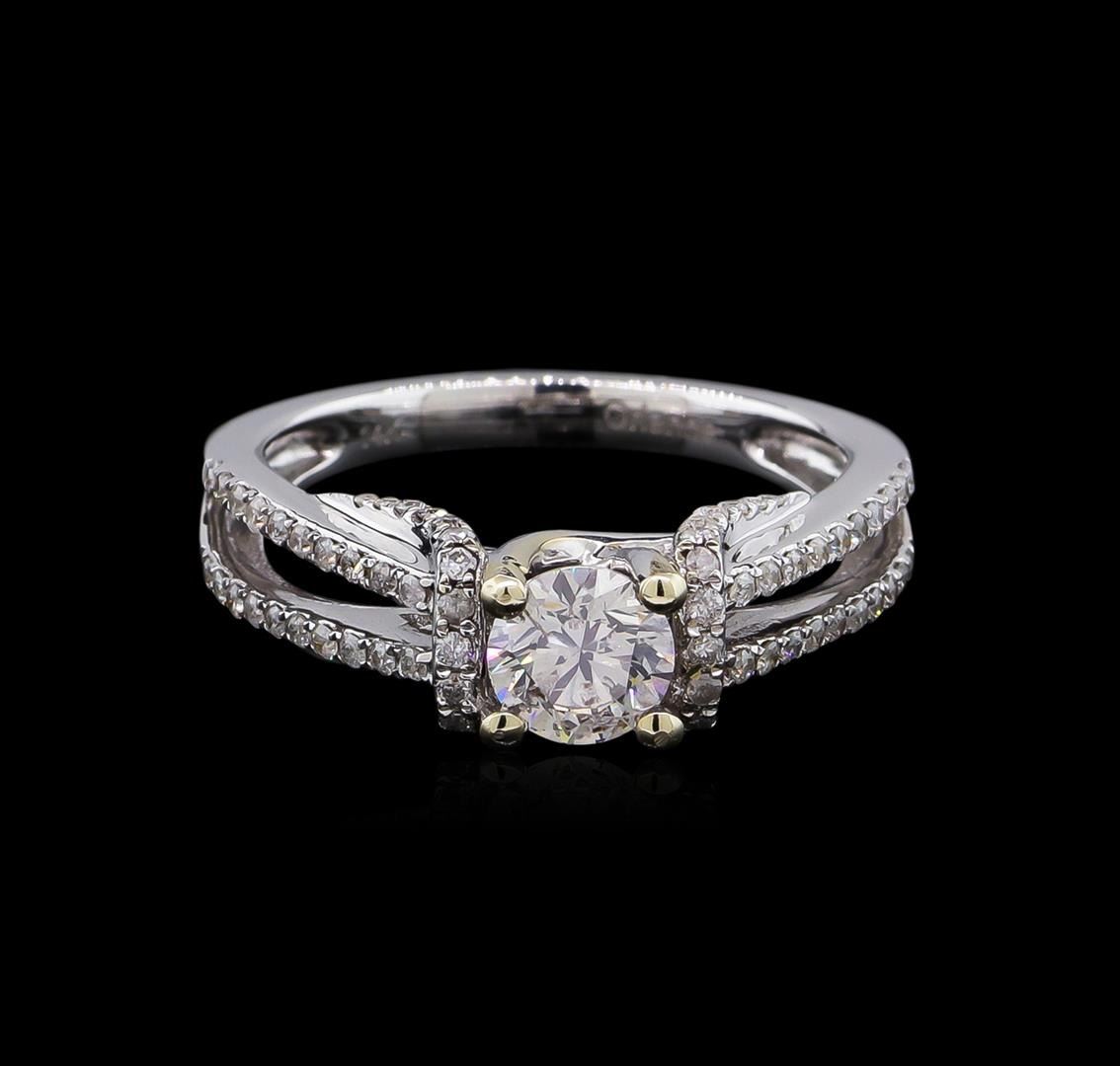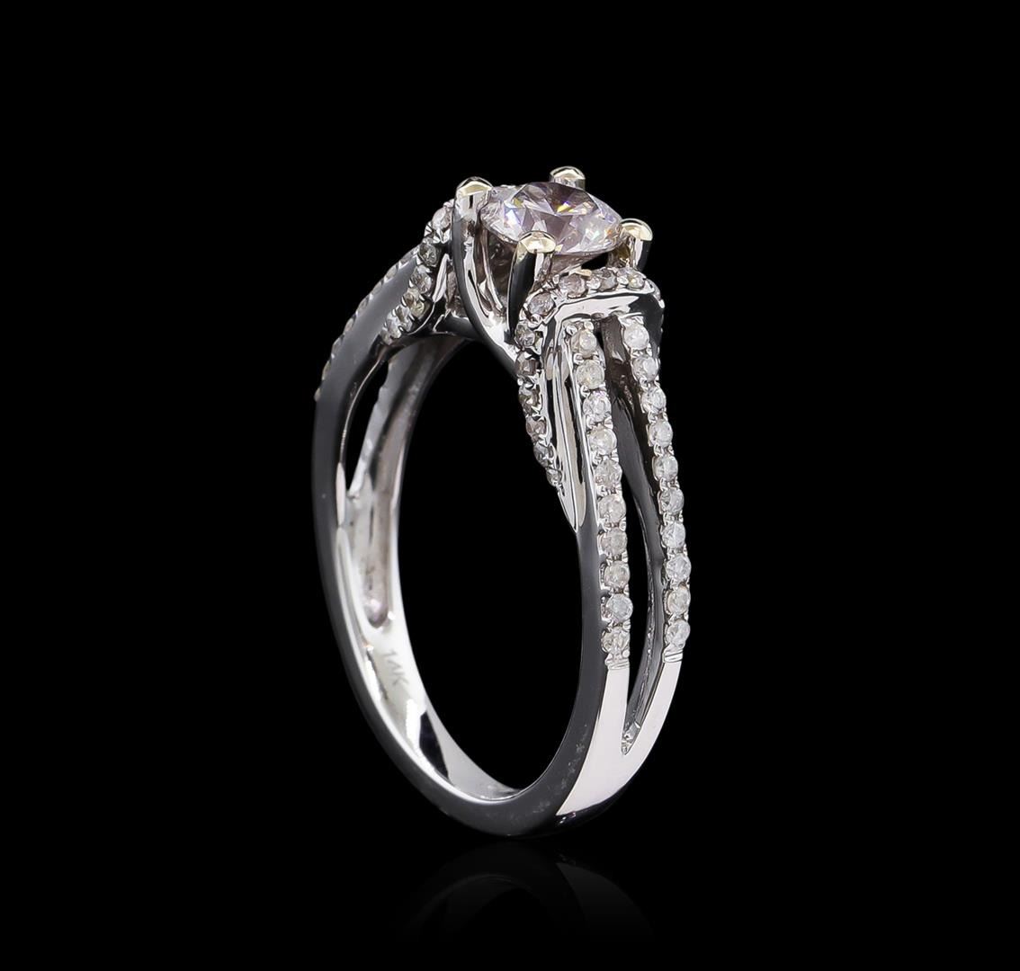 One electronically tested 14KT white gold Ladies combination cast & assembled engagement ring with a bright polish finish. Condition is new. Identified with markings of "14K". Containing: One prong set round brilliant cut diamond, measuring 5.50 - 5.50 x 3.30mm (depth est.) approximate weight of 0.61ct. Clarity: I-1. Color: G, Cut is Good. Seventy-Six prong set round brilliant cut diamonds, measuring 1.00 - 1.00 x 0.60mm (depth est.) approximate. Total Weight of 76 Stones = 0.27ct. Clarity: I-2 to I-3. Color: G - H, Cut is Fair. Total Weight of Diamonds 0.88ct. Total Weight of Ring 4.40 grams. GGL Appraised.