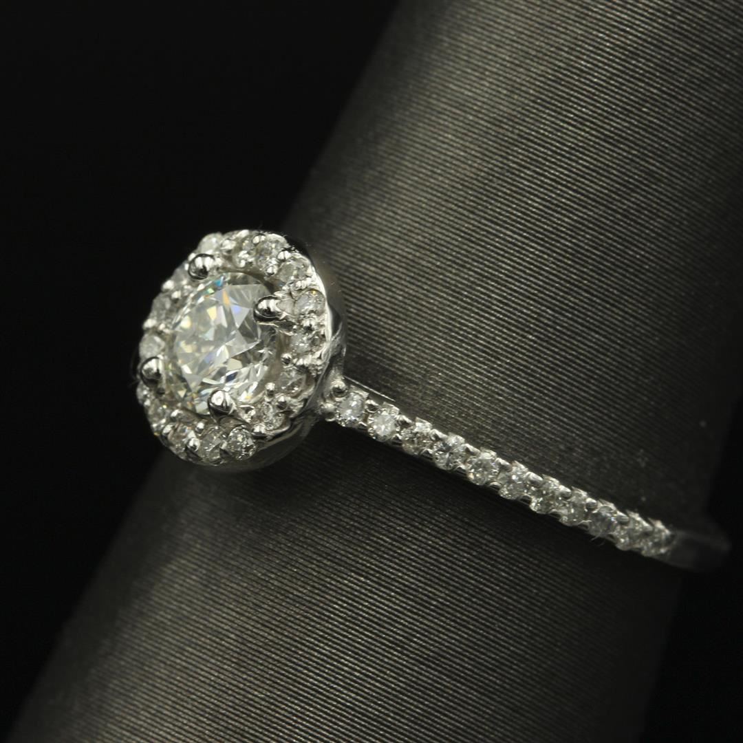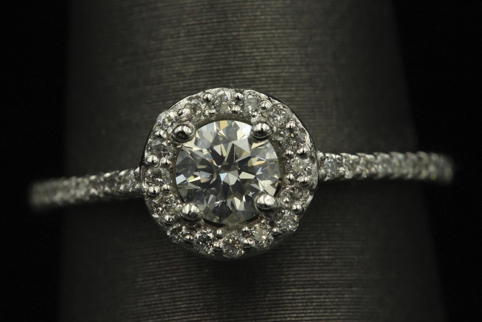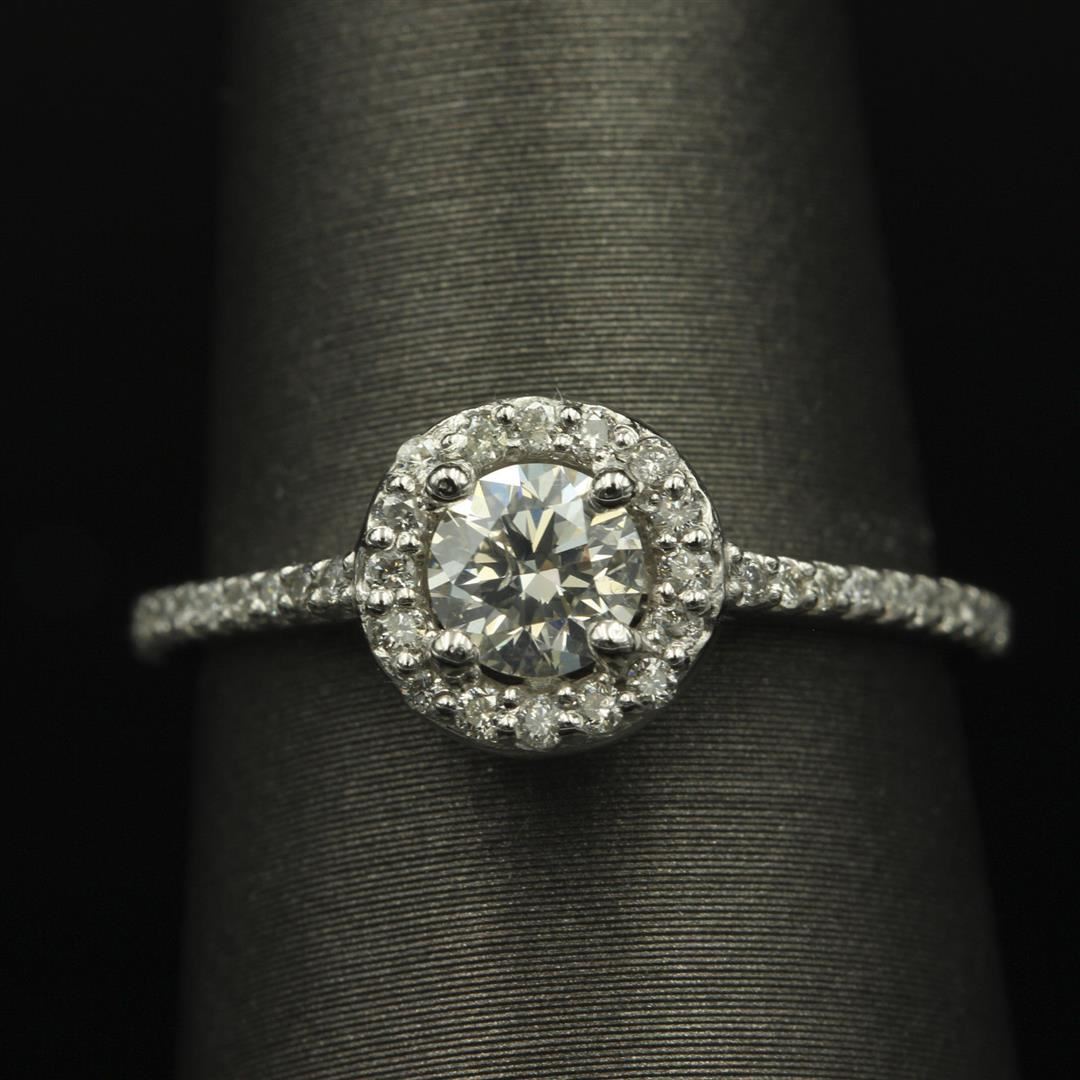 One Untreated Diamond Solitaire Engagement Ring in 14K White Gold. Gross weight is 1.98 grams. Gross carat weight is 0.61 carats. Condition is brand new. Ring size is 5.5 but can be resized free of charge. Main stone is 0.40 carats. Color is G-H, clarity SI2, and shape is round cut. Side stone is 0.21 carats, color G-H, and clarity SI1 with a total of 38 stones.