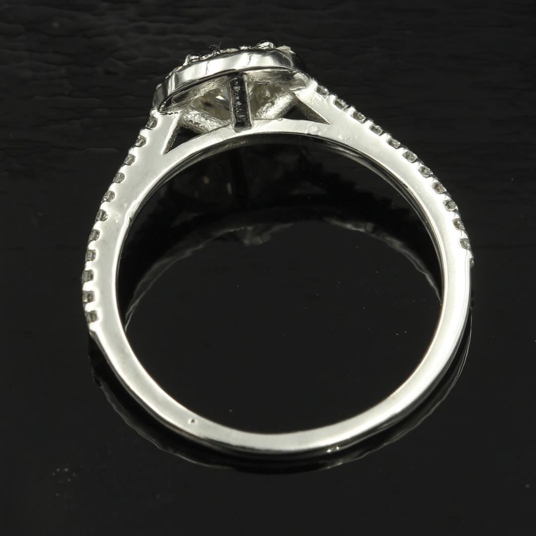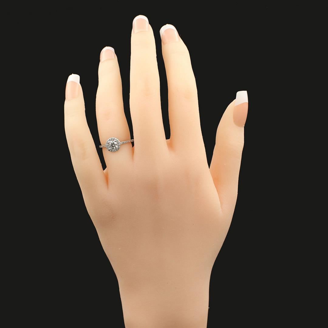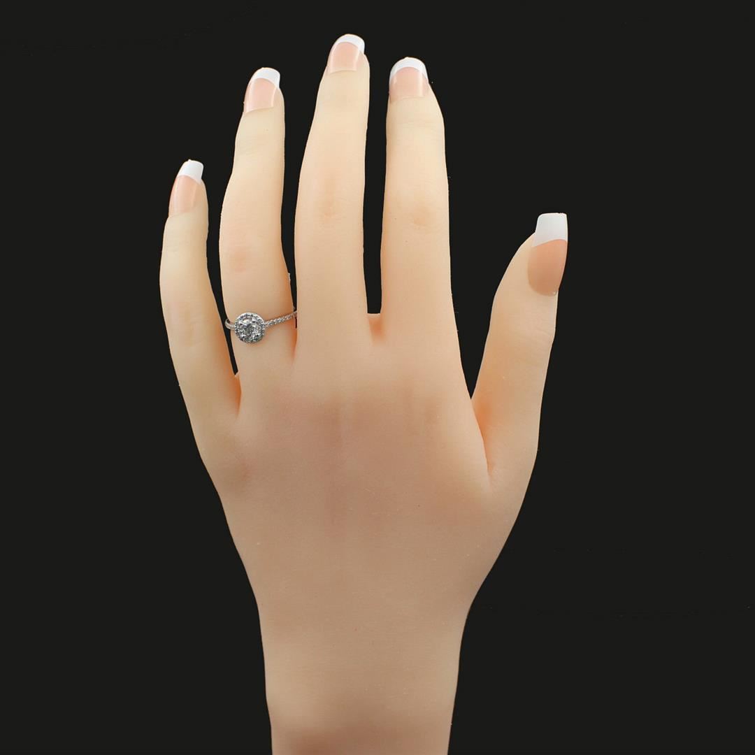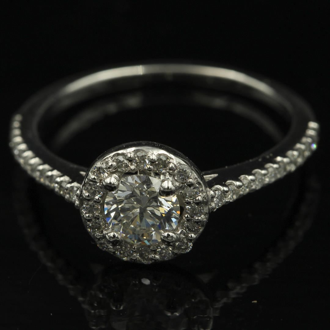 One Untreated Diamond Solitaire Engagement Ring in 14K White Gold. Gross weight is 1.98 grams. Gross carat weight is 0.61 carats. Condition is brand new. Ring size is 5.5 but can be resized free of charge. Main stone is 0.40 carats. Color is G-H, clarity SI2, and shape is round cut. Side stone is 0.21 carats, color G-H, and clarity SI1 with a total of 38 stones.