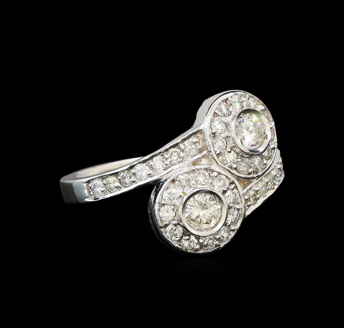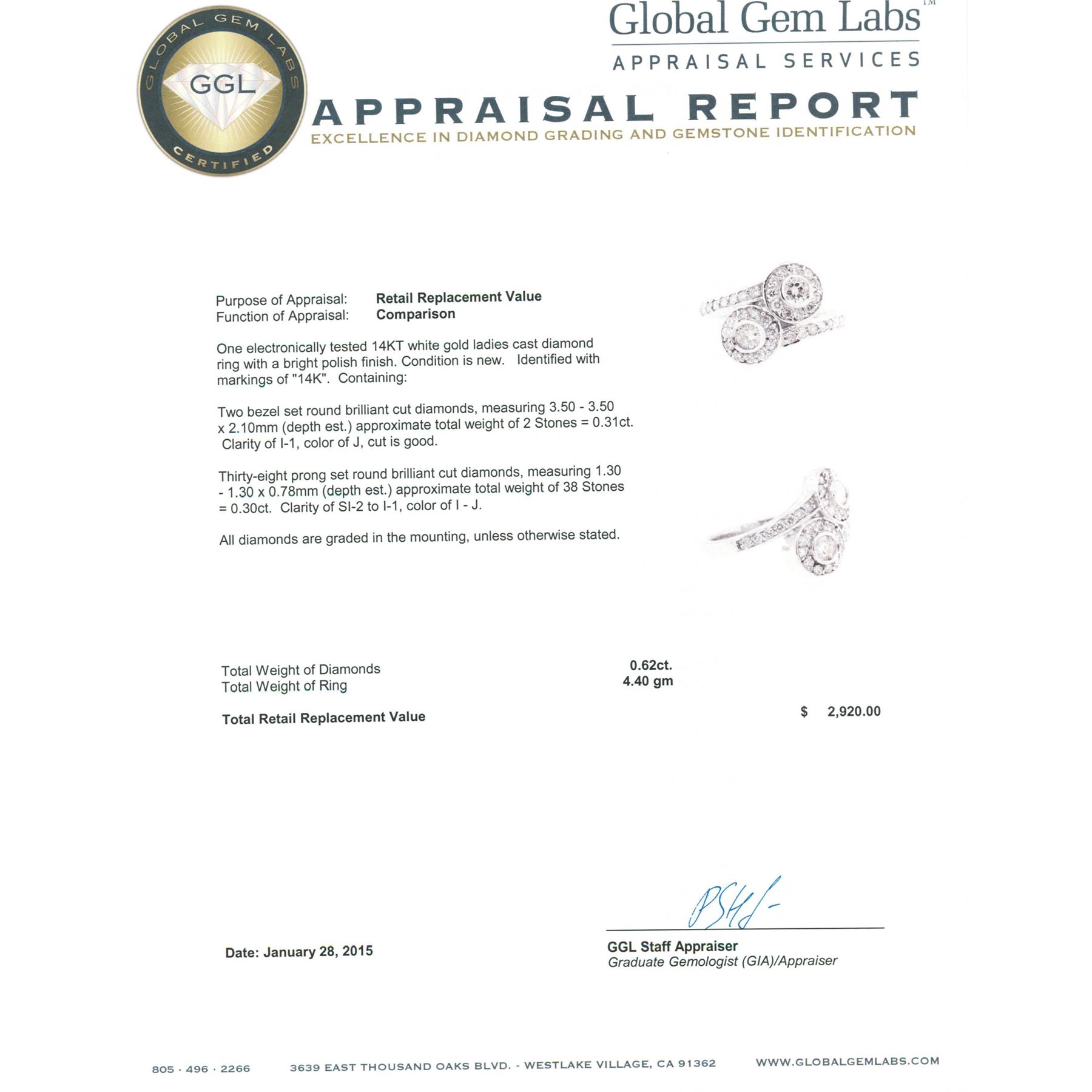 One electronically tested 14KT white gold ladies cast diamond ring with a bright polish finish. Identified with markings of "14K". Condition is new. Containing: Two bezel set round brilliant cut diamonds, measuring 3.50 - 3.50 x 2.10mm (depth est.) approximate total weight of 2 Stones = 0.31ct. Clarity: I-1. Color: J, Cut is Good. Thirty-Eight prong set round brilliant cut diamonds, measuring 1.30 - 1.30 x 0.78mm (depth est.) approximate total weight of 38 Stones = 0.30ct. Clarity: SI-2 to I-1. Color: I - J. All diamonds are graded in the mounting, unless otherwise stated. Total Weight of Diamonds 0.62ct. Total Weight of Ring 4.40 grams. GGL Appraised at $2,920.00.