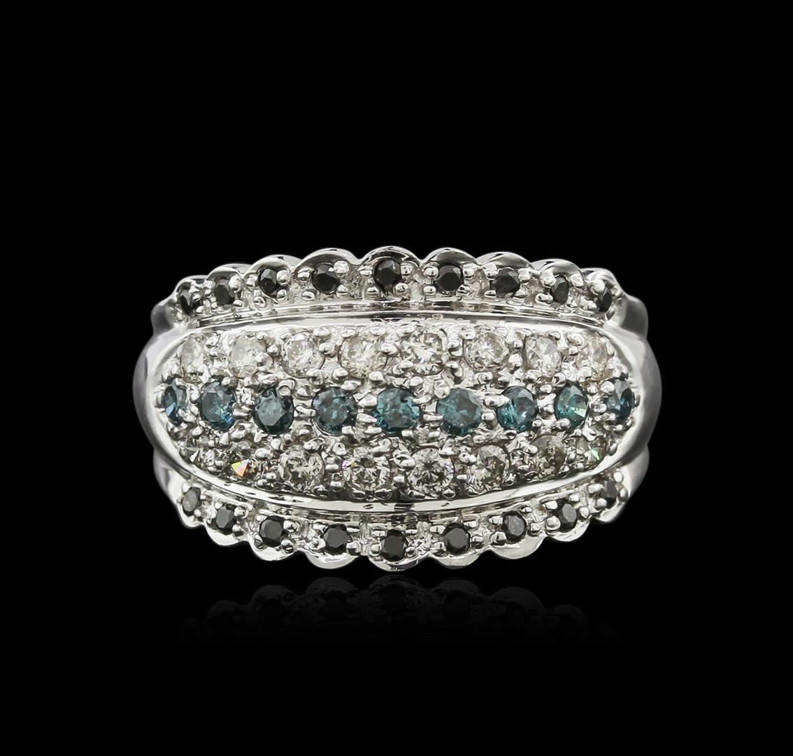 One electronically tested 14KT white gold ladies cast diamond ring with a bright polish finish. Identified with markings of "14K". Condition is very good. Containing: Eighteen prong set round brilliant cut diamonds, measuring 1.20 - 1.20 x 0.72mm (depth est.) approximate total weight of 18 Stones = 0.11ct. color of Fancy Black, Cut is Good. Nine prong set round brilliant cut diamonds, measuring 1.80 - 1.60 x 1.02mm (depth est.) approximate total weight of 9 Stones = 0.16ct. Clarity: I-1 to I-2, color of Fancy Blue, Cut is Good. Color of the stone has been treated. Sixteen prong set round brilliant cut diamonds, measuring 1.80 - 1.80 x 1.08mm (depth est.) approximate total weight of 16 Stones = 0.34ct. Clarity: I-1 to I-2. Color: J - K, Cut is Good. All diamonds are graded in the mounting, unless otherwise stated. Total Weight of Diamonds 0.62ct. Total Weight of Ring 6.40 grams. GGL Appraised at $2,325.00.