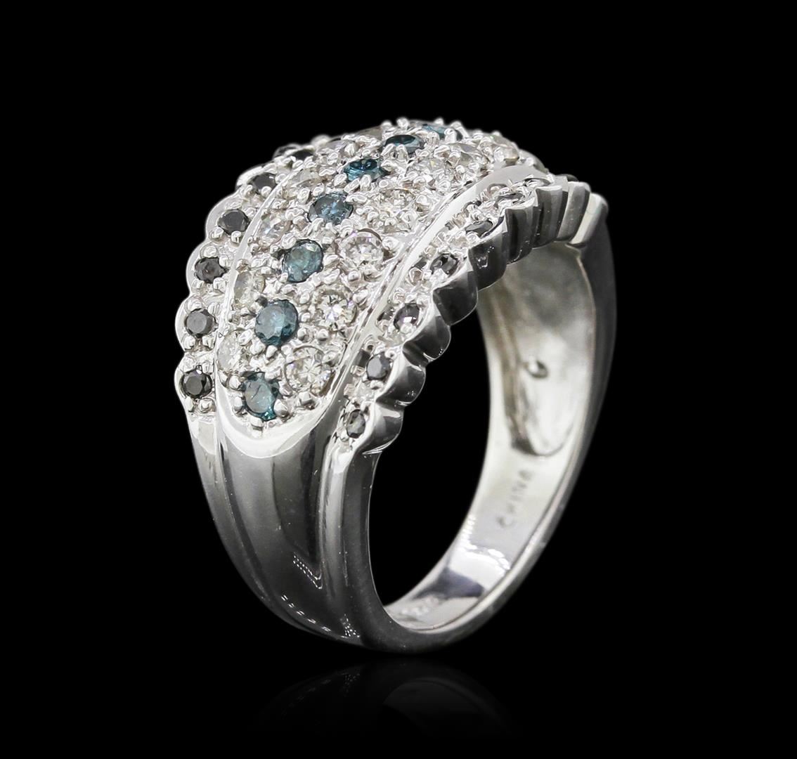 One electronically tested 14KT white gold ladies cast diamond ring with a bright polish finish. Identified with markings of "14K". Condition is very good. Containing: Eighteen prong set round brilliant cut diamonds, measuring 1.20 - 1.20 x 0.72mm (depth est.) approximate total weight of 18 Stones = 0.11ct. color of Fancy Black, Cut is Good. Nine prong set round brilliant cut diamonds, measuring 1.80 - 1.60 x 1.02mm (depth est.) approximate total weight of 9 Stones = 0.16ct. Clarity: I-1 to I-2, color of Fancy Blue, Cut is Good. Color of the stone has been treated. Sixteen prong set round brilliant cut diamonds, measuring 1.80 - 1.80 x 1.08mm (depth est.) approximate total weight of 16 Stones = 0.34ct. Clarity: I-1 to I-2. Color: J - K, Cut is Good. All diamonds are graded in the mounting, unless otherwise stated. Total Weight of Diamonds 0.62ct. Total Weight of Ring 6.40 grams. GGL Appraised at $2,325.00.