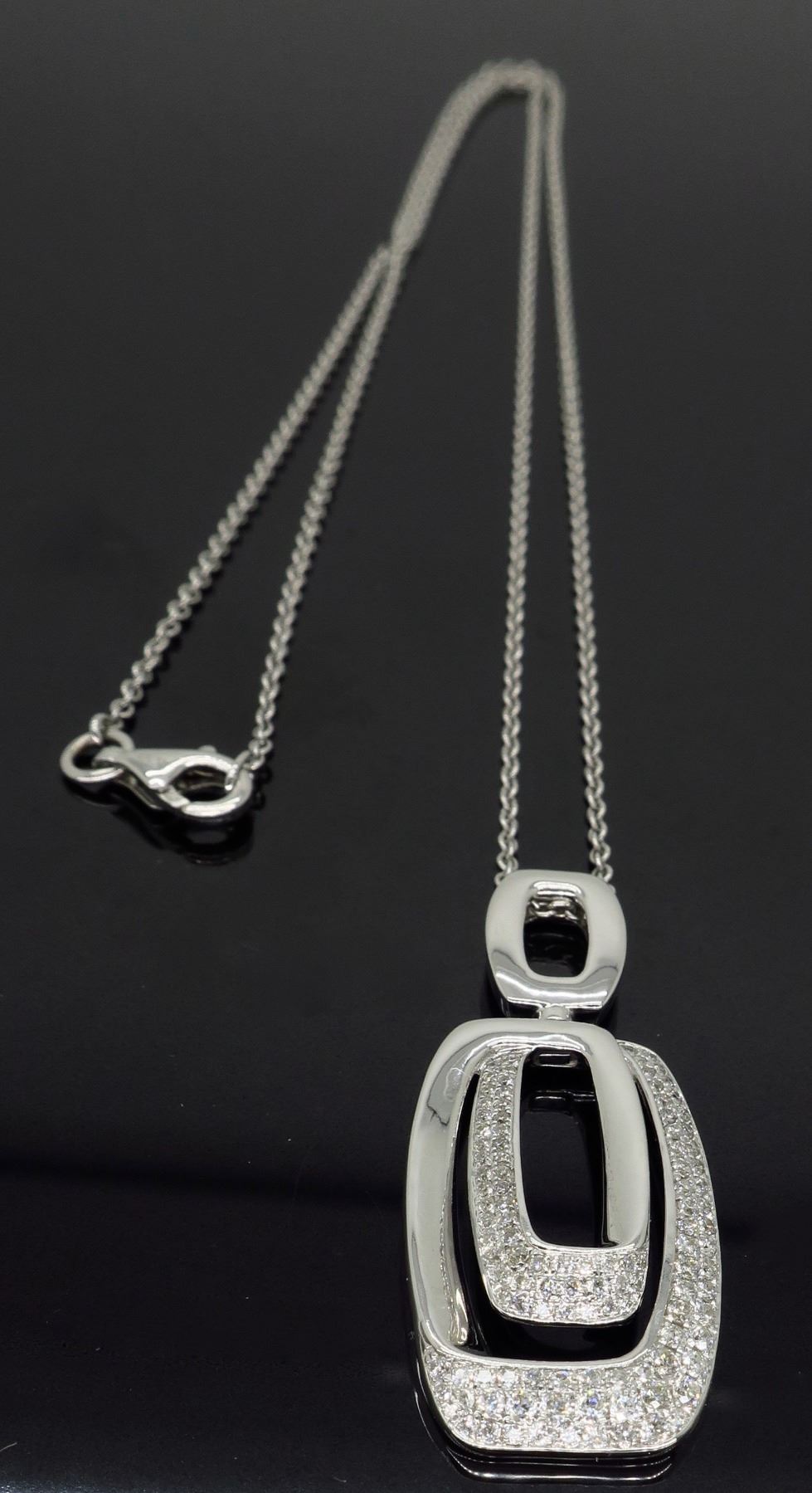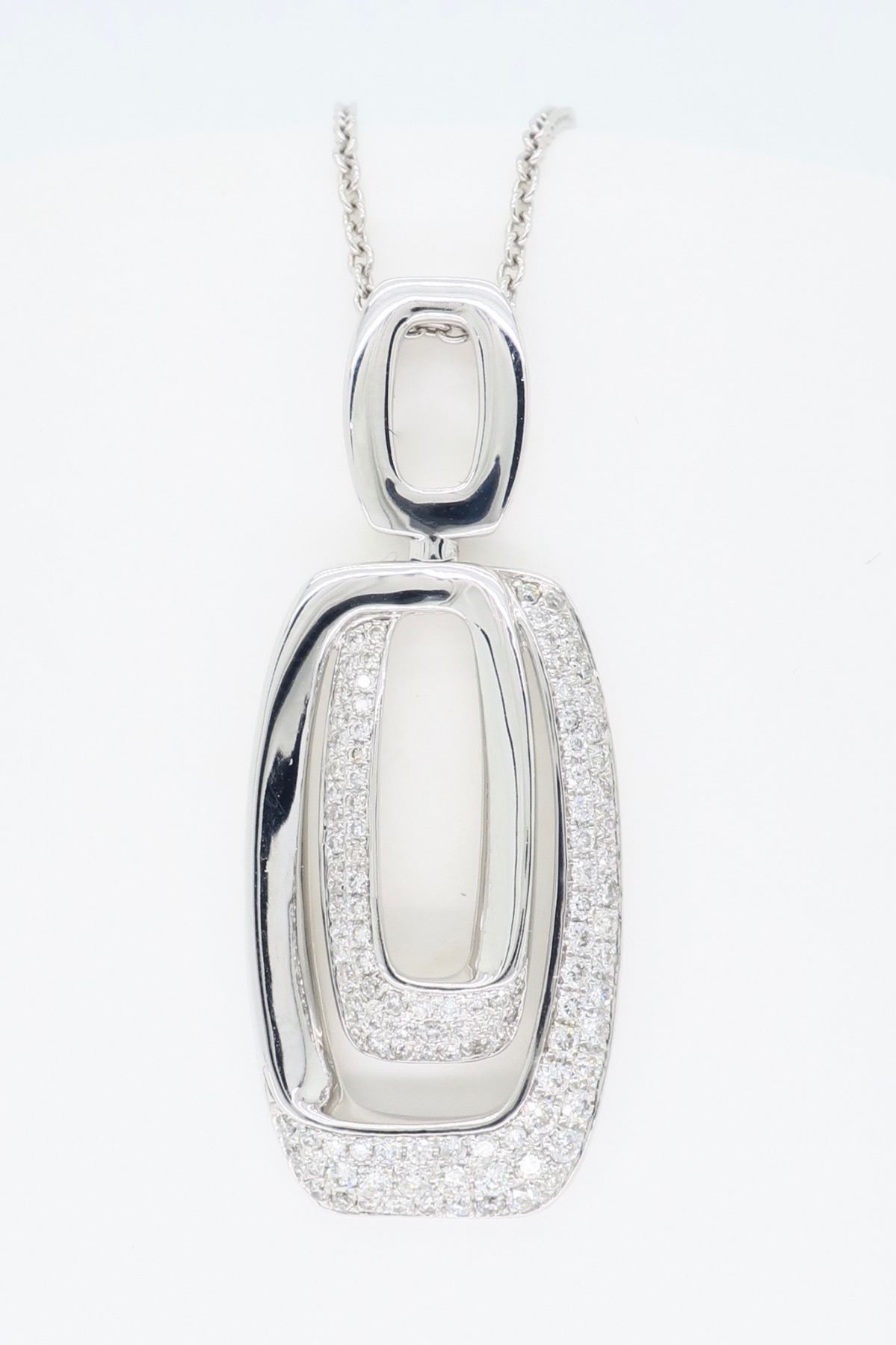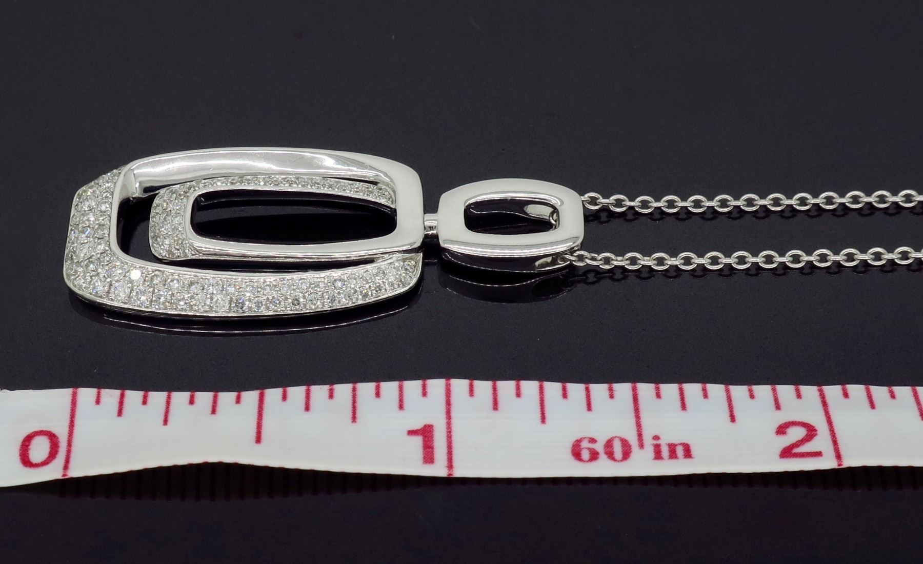 One 14KT White Gold 0.625ctw Diamond Pendant with Chain. Round Diamonds with a total weight of 0.625cts with a color of G-J and clarity of SI-1. Total weight of this pendant is 9.2 grams. Total length of this chain is 18 inches. Pendant length is 1.5 inches long.