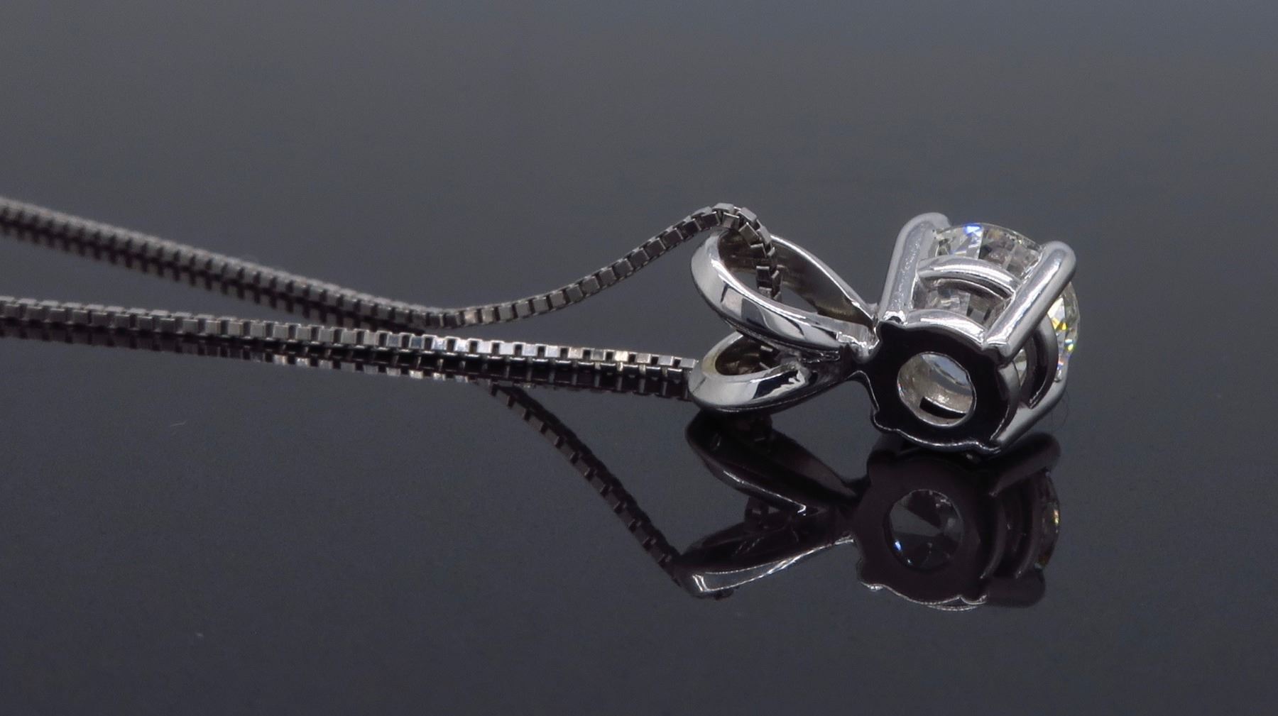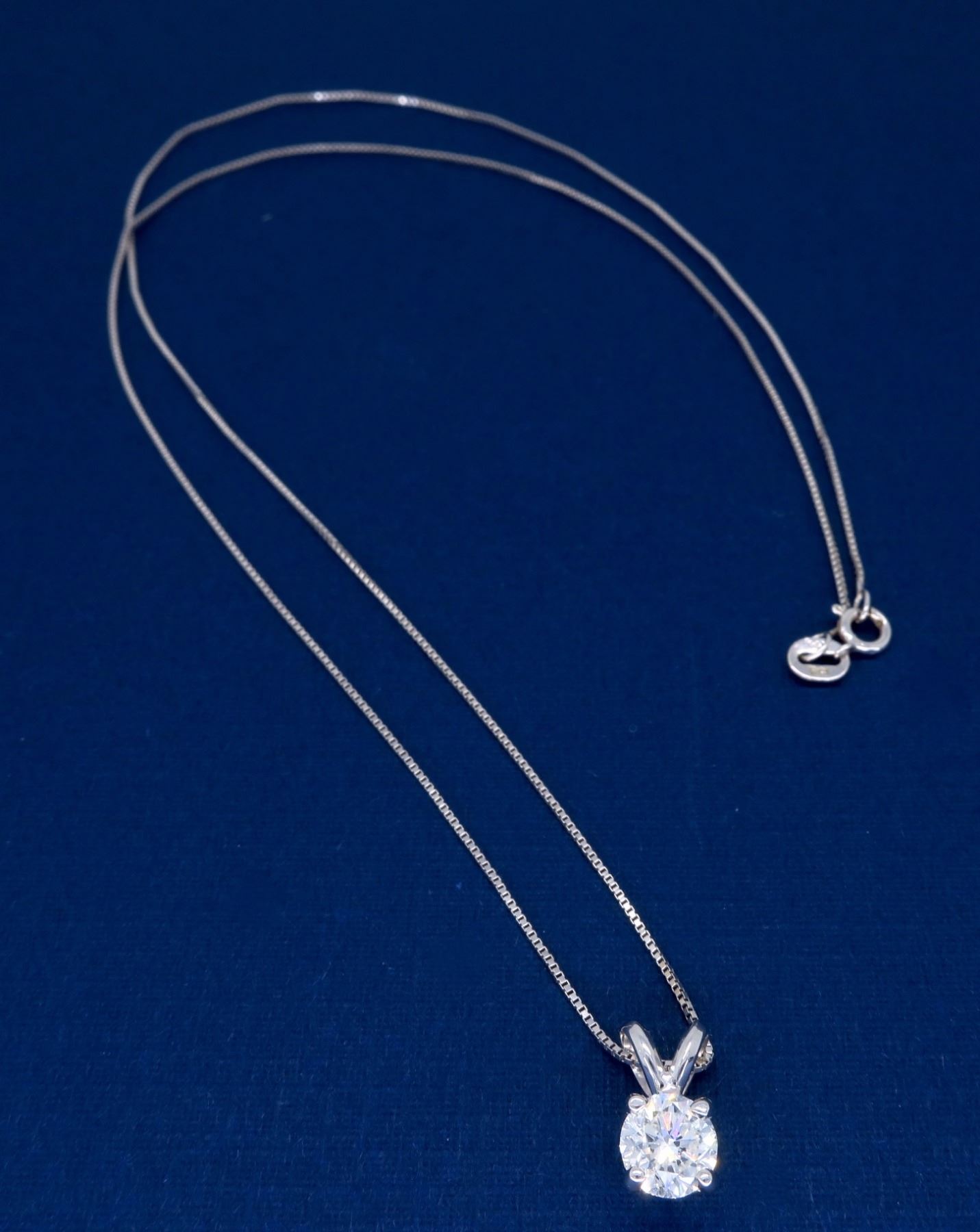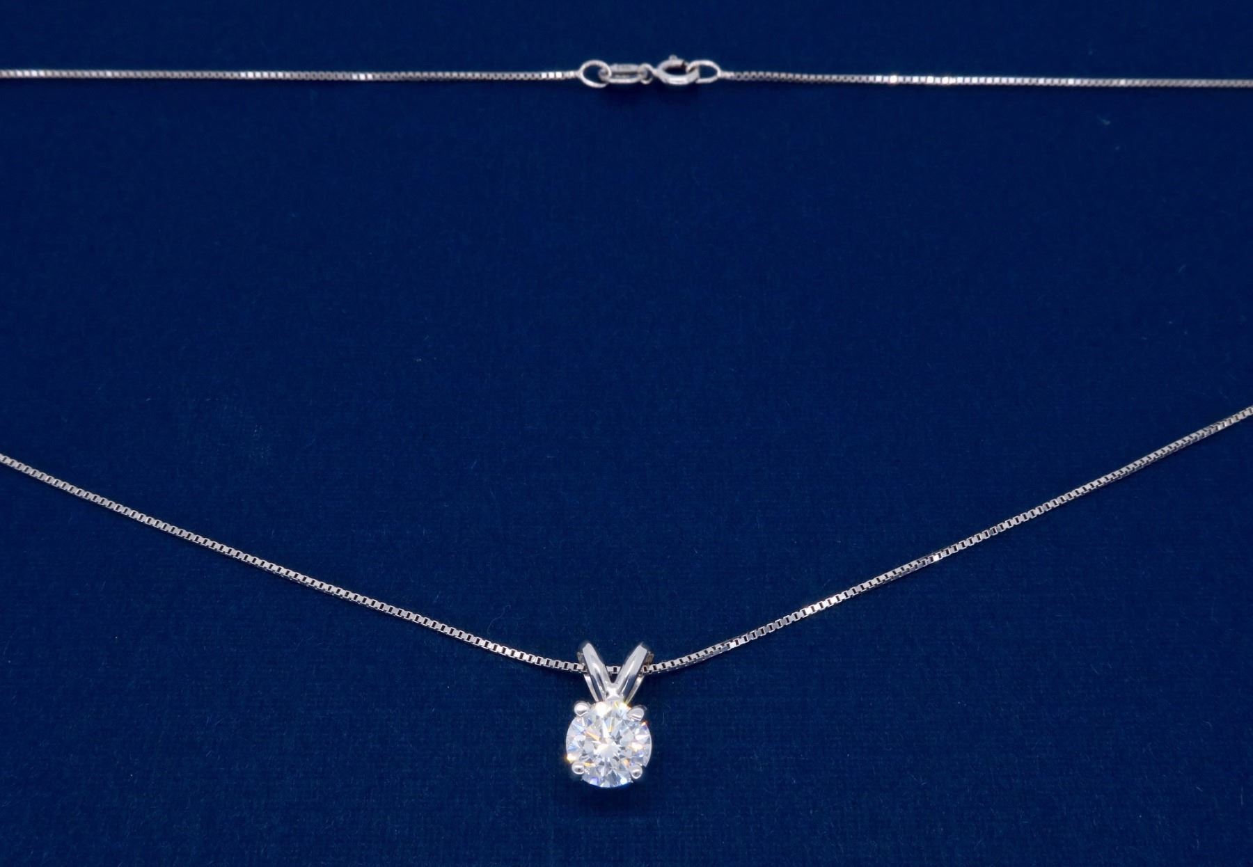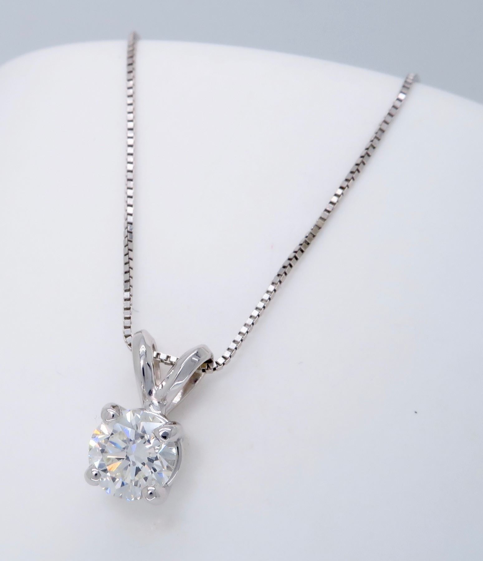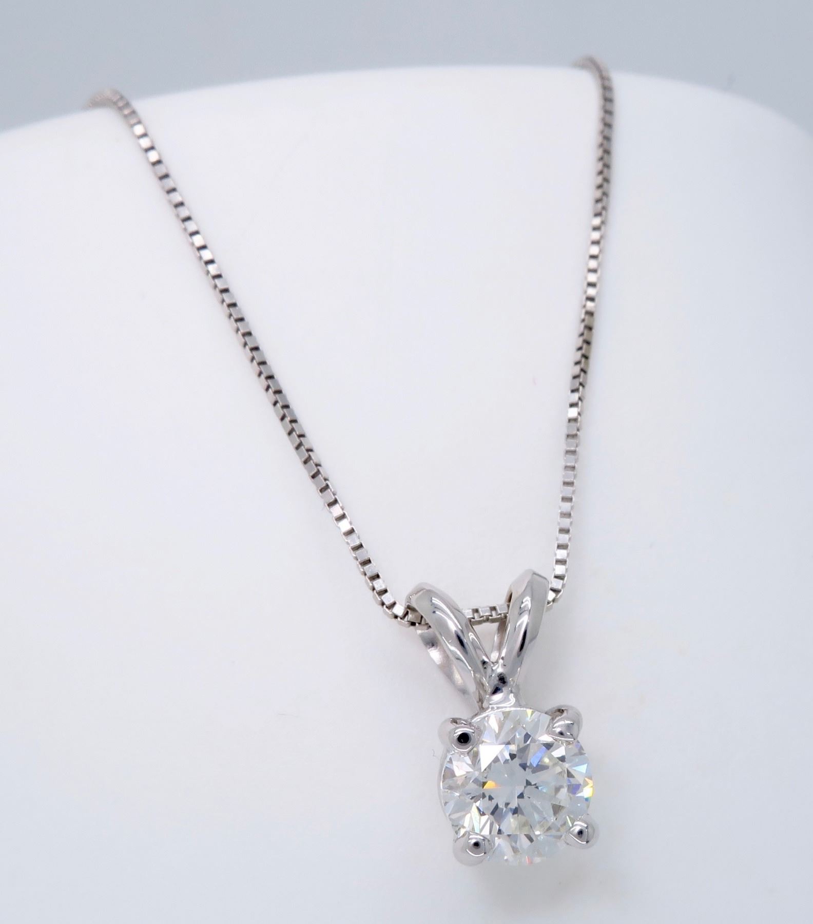 One 14KT White Gold 0.62ct Diamond Pendant with Chain. (1) Round Diamond with a total weight of 0.62cts with a color of H-I and clarity of VS-2. Total length of this chain is 18 inches. Total weight of this pendant with chain is 1.8 grams.
