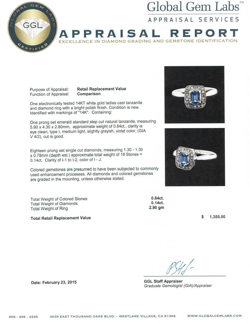 One electronically tested 14KT white gold ladies cast tanzanite and diamond ring with a bright polish finish. Identified with markings of "14K". Condition is new. Containing: One prong set emerald standard step cut natural tanzanite, measuring 5.90 x 4.30 x 2.80mm, approximate weight of 0.64ct., clarity is eye clean, type I, medium light, slightly grayish, violet color, (GIA V 4/2), cut is good. Eighteen prong set single cut diamonds, measuring 1.30 - 1.30 x 0.78mm (depth est.) approximate total weight of 18 Stones = 0.14ct. Clarity: I-1 to I-2. Color: I - J. Colored gemstones are presumed to have been subjected to commonly used enhancement processes. All diamonds and colored gemstones are graded in the mounting, unless otherwise stated. Total Weight of Colored Stones 0.64ct. Total Weight of Diamonds 0.14ct. Total Weight of Ring 2.90 grams. GGL Appraised.