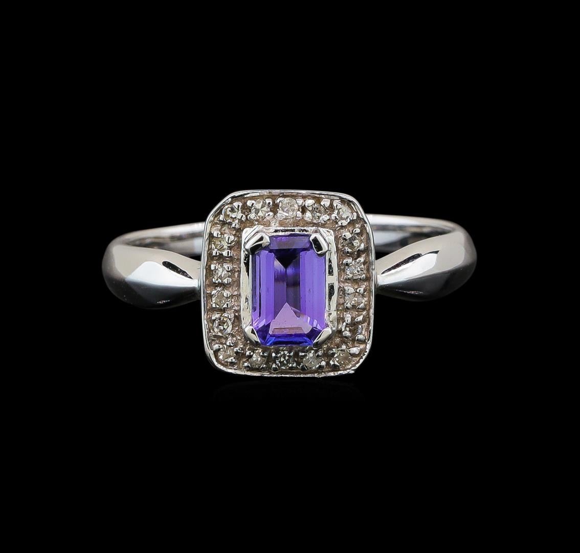 One electronically tested 14KT white gold ladies cast tanzanite and diamond ring with a bright polish finish. Identified with markings of "14K". Condition is new. Containing: One prong set emerald standard step cut natural tanzanite, measuring 5.90 x 4.30 x 2.80mm, approximate weight of 0.64ct., clarity is eye clean, type I, medium light, slightly grayish, violet color, (GIA V 4/2), cut is good. Eighteen prong set single cut diamonds, measuring 1.30 - 1.30 x 0.78mm (depth est.) approximate total weight of 18 Stones = 0.14ct. Clarity: I-1 to I-2. Color: I - J. Colored gemstones are presumed to have been subjected to commonly used enhancement processes. All diamonds and colored gemstones are graded in the mounting, unless otherwise stated. Total Weight of Colored Stones 0.64ct. Total Weight of Diamonds 0.14ct. Total Weight of Ring 2.90 grams. GGL Appraised.