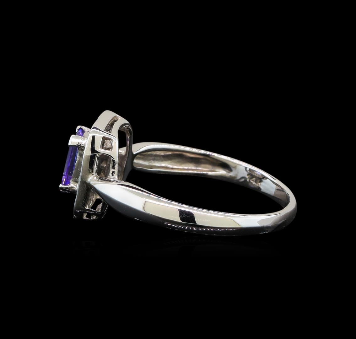 One electronically tested 14KT white gold ladies cast tanzanite and diamond ring with a bright polish finish. Identified with markings of "14K". Condition is new. Containing: One prong set emerald standard step cut natural tanzanite, measuring 5.90 x 4.30 x 2.80mm, approximate weight of 0.64ct., clarity is eye clean, type I, medium light, slightly grayish, violet color, (GIA V 4/2), cut is good. Eighteen prong set single cut diamonds, measuring 1.30 - 1.30 x 0.78mm (depth est.) approximate total weight of 18 Stones = 0.14ct. Clarity: I-1 to I-2. Color: I - J. Colored gemstones are presumed to have been subjected to commonly used enhancement processes. All diamonds and colored gemstones are graded in the mounting, unless otherwise stated. Total Weight of Colored Stones 0.64ct. Total Weight of Diamonds 0.14ct. Total Weight of Ring 2.90 grams. GGL Appraised.