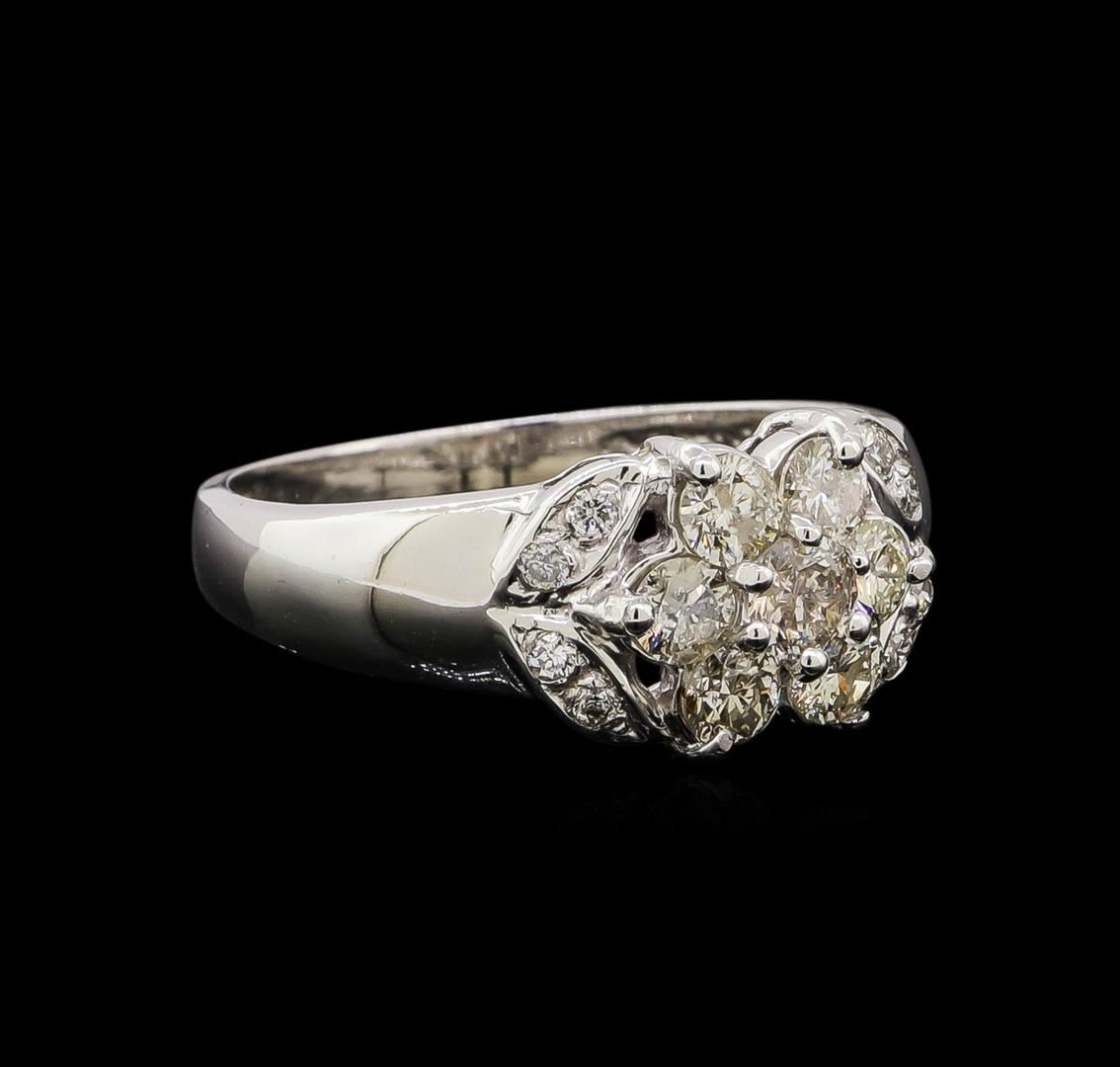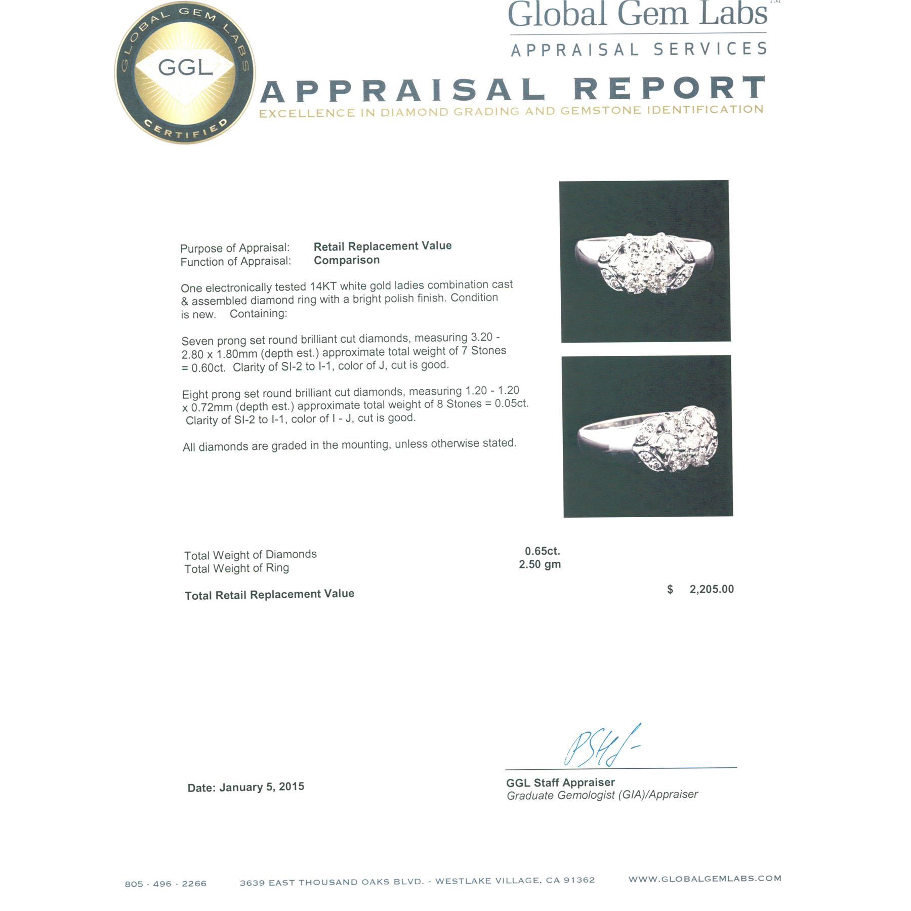 One electronically tested 14KT white gold ladies combination cast & assembled diamond ring with a bright polish finish. Condition is new. Containing: Seven prong set round brilliant cut diamonds, measuring 3.20 - 2.80 x 1.80mm (depth est.) approximate total weight of 7 Stones = 0.60ct. Clarity: SI-2 to I-1. Color: J, Cut is Good. Eight prong set round brilliant cut diamonds, measuring 1.20 - 1.20 x 0.72mm (depth est.) approximate total weight of 8 Stones = 0.05ct. Clarity: SI-2 to I-1. Color: I - J, Cut is Good. All diamonds are graded in the mounting, unless otherwise stated. Total Weight of Diamonds 0.65ct. Total Weight of Ring 2.50 grams. GGL Appraised at $2,205.00.