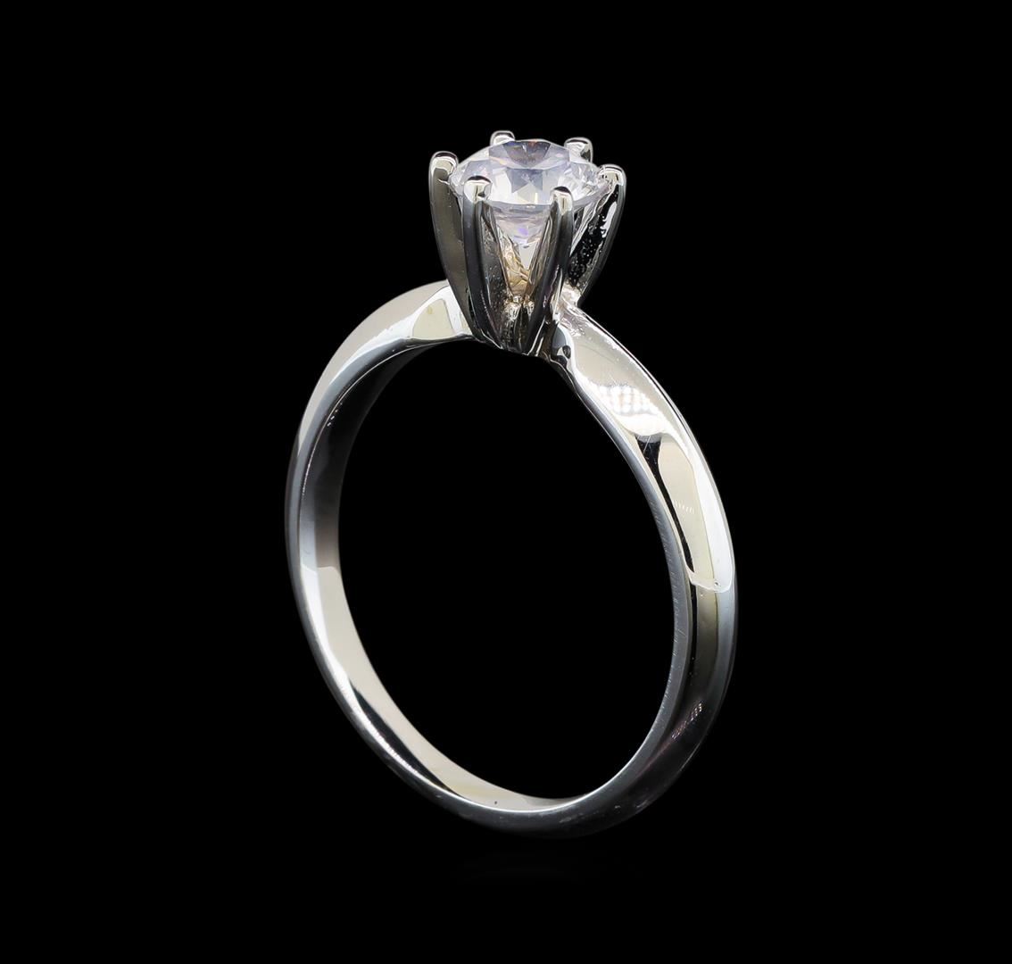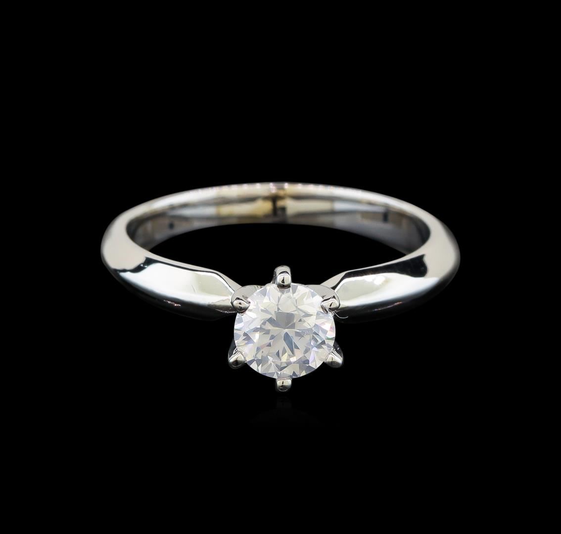 One electronically tested 14KT white gold ladies cast diamond solitaire ring with a knife edge shank with a bright polish finish. Identified with markings of "14K". Condition is new. Containing: One prong set round brilliant cut diamond, measuring 5.45 - 5.45 x 3.27mm (depth est.) exact weight 0.65ct. Clarity: I-1. Color: I, Cut is Good. Diamonds are graded in the mounting, unless otherwise stated. Total Weight of Diamonds 0.65ct. Total Weight of Solitaire Ring 2.90 grams. GGL Appraised.