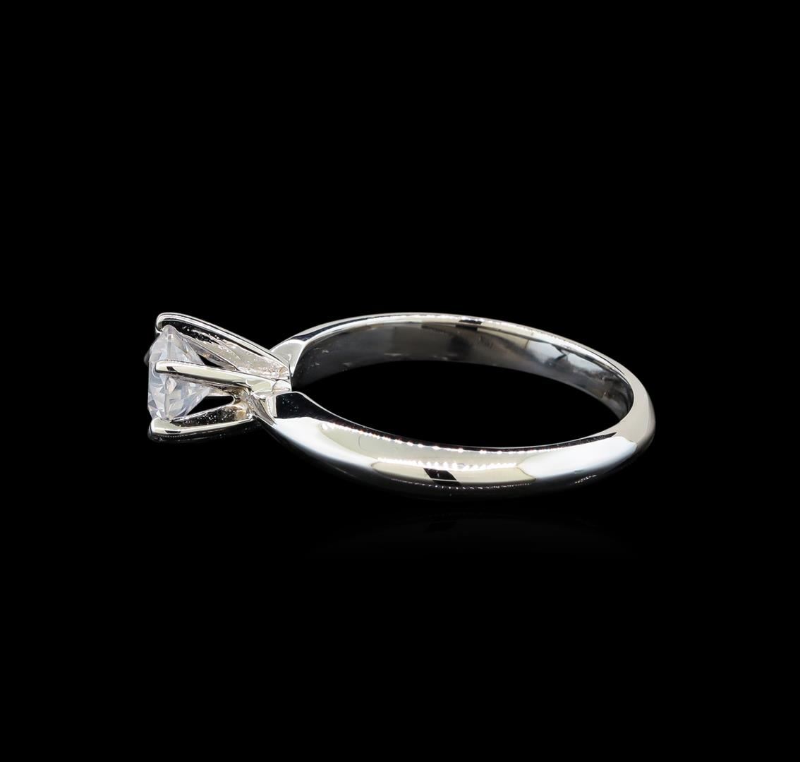 One electronically tested 14KT white gold ladies cast diamond solitaire ring with a knife edge shank with a bright polish finish. Identified with markings of "14K". Condition is new. Containing: One prong set round brilliant cut diamond, measuring 5.45 - 5.45 x 3.27mm (depth est.) exact weight 0.65ct. Clarity: I-1. Color: I, Cut is Good. Diamonds are graded in the mounting, unless otherwise stated. Total Weight of Diamonds 0.65ct. Total Weight of Solitaire Ring 2.90 grams. GGL Appraised.