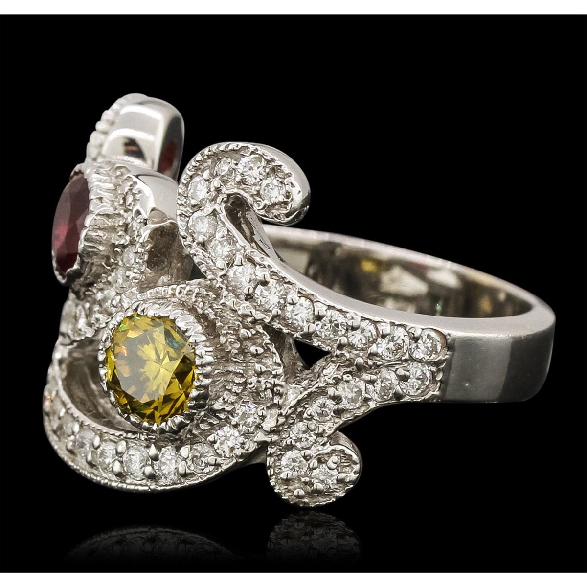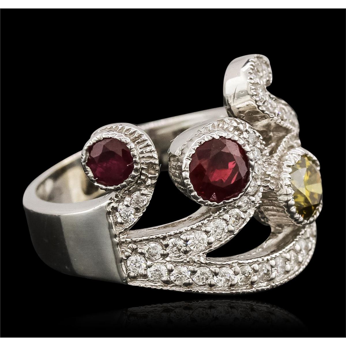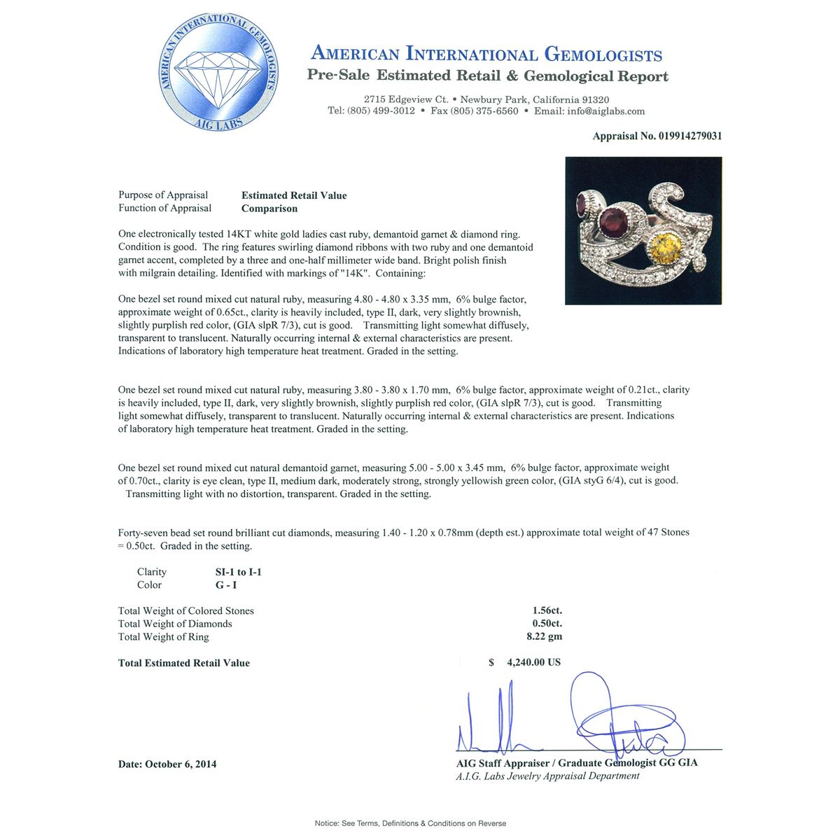 One electronically tested 14KT white gold ladies cast ruby, demantoid garnet & diamond ring. The ring features swirling diamond ribbons with two ruby and one demantoid garnet accent, completed by a three and one-half millimeter wide band. Bright polish finish with milgrain detailing. Identified with markings of "14K". Condition is good. Containing: One bezel set round mixed cut natural ruby, measuring 4.80 - 4.80 x 3.35 mm, 6%. bulge factor, approximate weight of 0.65ct., clarity is heavily included, type II, dark, very slightly brownish, slightly purplish red color, (GIA slpR 7/3), cut is good. Transmitting light somewhat diffusely, transparent to translucent. Naturally occurring internal & external characteristics are present. Indications of laboratory high temperature heat treatment. Graded in the setting. One bezel set round mixed cut natural ruby, measuring 3.80 - 3.80 x 1.70 mm, 6%. bulge factor, approximate weight of 0.21ct., clarity is heavily included, type II, dark, very slightly brownish, slightly purplish red color, (GIA slpR 7/3), cut is good. Transmitting light somewhat diffusely, transparent to translucent. Naturally occurring internal & external characteristics are present. Indications of laboratory high temperature heat treatment. Graded in the setting. One bezel set round mixed cut natural demantoid garnet, measuring 5.00 - 5.00 x 3.45 mm, 6%. bulge factor, approximate weight of 0.70ct., clarity is eye clean, type II, medium dark, moderately strong, strongly yellowish green color, (GIA styG 6/4), cut is good. Transmitting light with no distortion, transparent. Graded in the setting. Forty-Seven bead set round brilliant cut diamonds, measuring 1.40 - 1.20 x 0.78mm (depth est.) approximate. Total Weight of 47 Stones = 0.50ct. Graded in the setting. Clarity: SI-1 to I-1. Color: G - I. Total Weight of Colored Stones 1.56ct. Total Weight of Diamonds 0.50ct. Total Weight of Ring 8.22gm. AIG Appraised at $4,240.00.