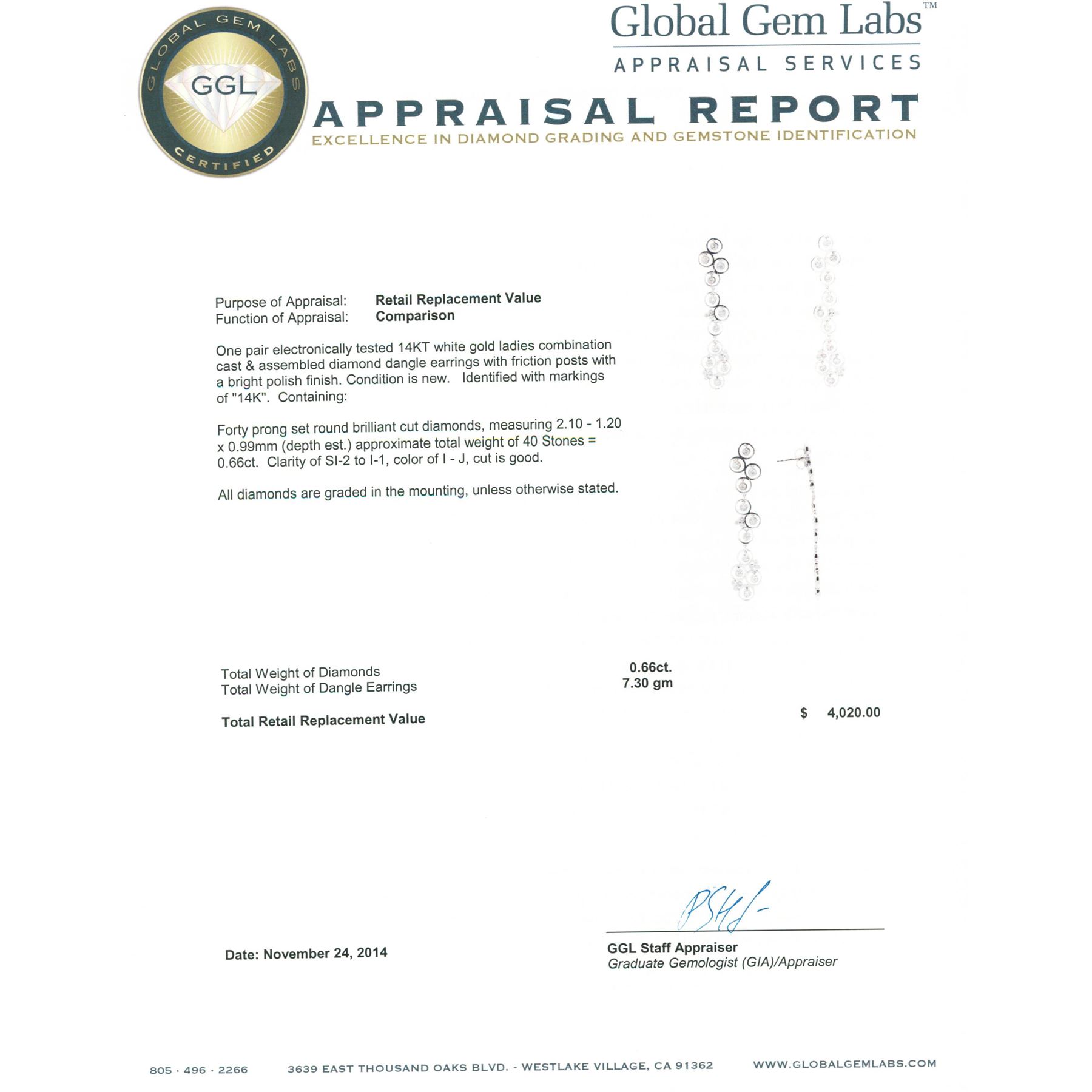 One pair electronically tested 14KT white gold ladies combination cast & assembled diamond dangle earrings with friction posts with a bright polish finish. Identified with markings of "14K". Condition is new. Containing: Forty prong set round brilliant cut diamonds, measuring 2.10 - 1.20 x 0.99mm (depth est.) approximate total weight of 40 Stones = 0.66ct. . Clarity: SI-2 to I-1. Color: I - J, Cut is Good. All diamonds are graded in the mounting, unless otherwise stated. Total Weight of Diamonds 0.66ct. Total Weight of Dangle Earrings 7.30 grams. GGL Appraised.