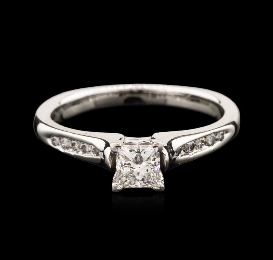 One electronically tested 14KT white gold ladies cast diamond engagement ring with a half round shank with a bright polish finish. Identified with markings of "14K". Condition is new. Containing: One prong set princess cut diamond, measuring 4.59 x 4.51 x 3.39mm (depth est.) approximate weight of 0.58ct. Clarity: VS-2. Color: I, Cut is Good. Ten prong set round brilliant cut diamonds, measuring 1.40 - 1.20 x 0.78mm (depth est.) approximate total weight of 10 Stones = 0.08ct. Clarity: SI-1 to SI-2. Color: I - J, Cut is Good. All diamonds are graded in the mounting, unless otherwise stated. Total Weight of Diamonds 0.66ct. Total Weight of Engagement Ring 4.60 grams. GGL Appraised at $4,165.00.