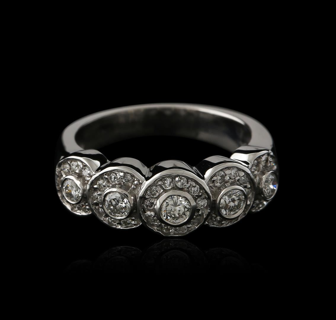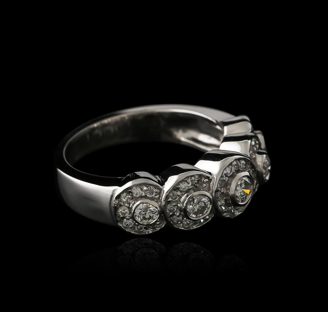 One electronically tested 14KT white gold ladies cast diamond ring with a bright polish finish. Identified with markings of "14K". Condition is new. Containing: Four bezel set round brilliant cut diamonds, measuring 2.50 - 2.50 x 1.50mm (depth est.) approximate total weight of 4 Stones = 0.30ct. Clarity: SI-2 to I-1. Color: H - I, Cut is Good. Thirty-Nine prong set round brilliant cut diamonds, measuring 1.30 - 1.30 x 0.78mm (depth est.) approximate total weight of 39 Stones = 0.37ct. Clarity: I-1 to I-2. Color: I - J, Cut is Good. Diamonds are graded in the mounting, unless otherwise stated. Total Weight of Diamonds 0.67ct. Total Weight of Ring 5.70 grams. GGL Appraised at $1,995.00.