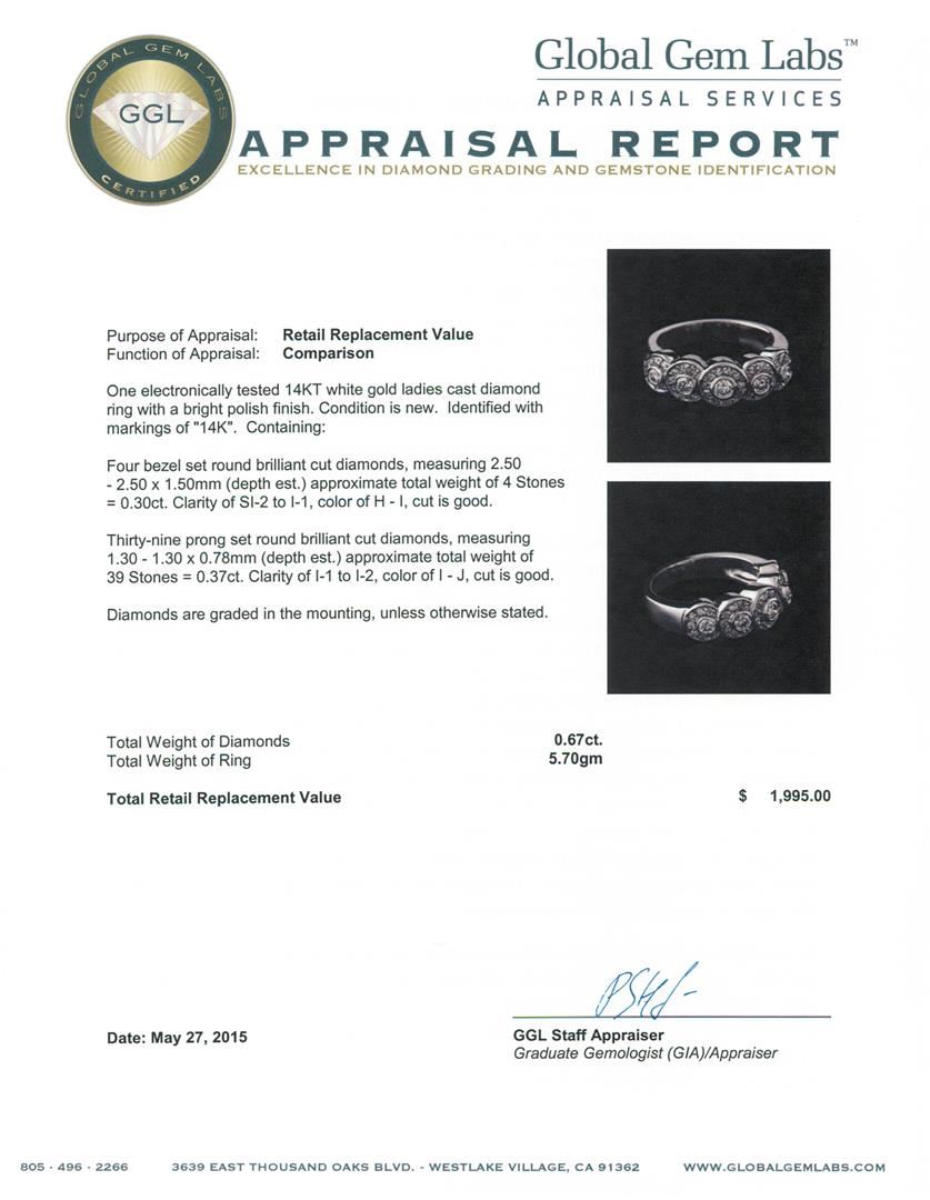One electronically tested 14KT white gold ladies cast diamond ring with a bright polish finish. Identified with markings of "14K". Condition is new. Containing: Four bezel set round brilliant cut diamonds, measuring 2.50 - 2.50 x 1.50mm (depth est.) approximate total weight of 4 Stones = 0.30ct. Clarity: SI-2 to I-1. Color: H - I, Cut is Good. Thirty-Nine prong set round brilliant cut diamonds, measuring 1.30 - 1.30 x 0.78mm (depth est.) approximate total weight of 39 Stones = 0.37ct. Clarity: I-1 to I-2. Color: I - J, Cut is Good. Diamonds are graded in the mounting, unless otherwise stated. Total Weight of Diamonds 0.67ct. Total Weight of Ring 5.70 grams. GGL Appraised at $1,995.00.