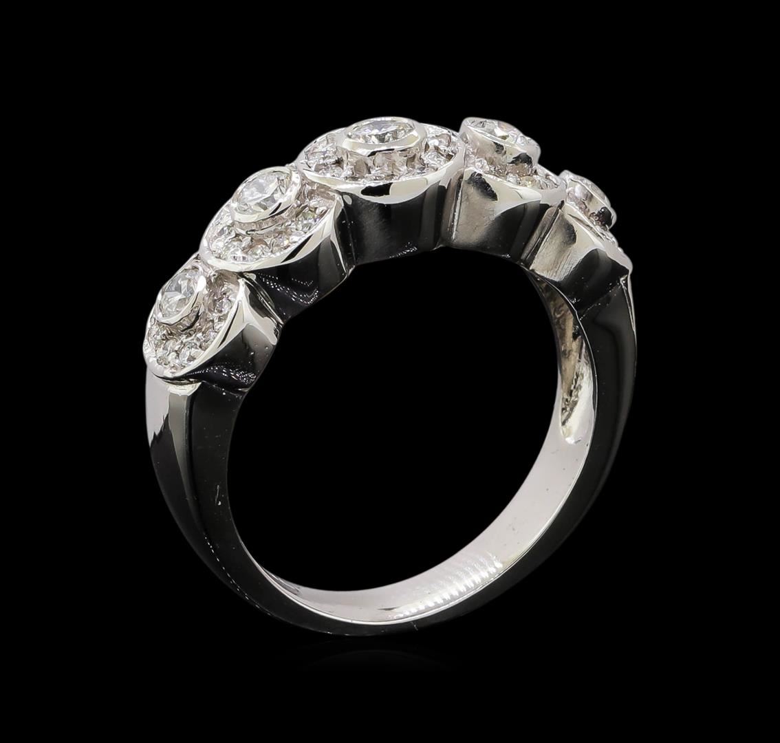 One electronically tested 14KT white gold ladies cast diamond ring with a bright polish finish. Identified with markings of "14K". Condition is new. Containing: Four bezel set round brilliant cut diamonds, measuring 2.50 - 2.50 x 1.50mm (depth est.) approximate total weight of 4 Stones = 0.30ct. Clarity: SI-2 to I-1. Color: H - I, Cut is Good. Thirty-Nine prong set round brilliant cut diamonds, measuring 1.30 - 1.30 x 0.78mm (depth est.) approximate total weight of 39 Stones = 0.37ct. Clarity: I-1 to I-2. Color: I - J, Cut is Good. Diamonds are graded in the mounting, unless otherwise stated. Total Weight of Diamonds 0.67ct. Total Weight of Ring 5.70 grams. GGL Appraised at $1,995.00.