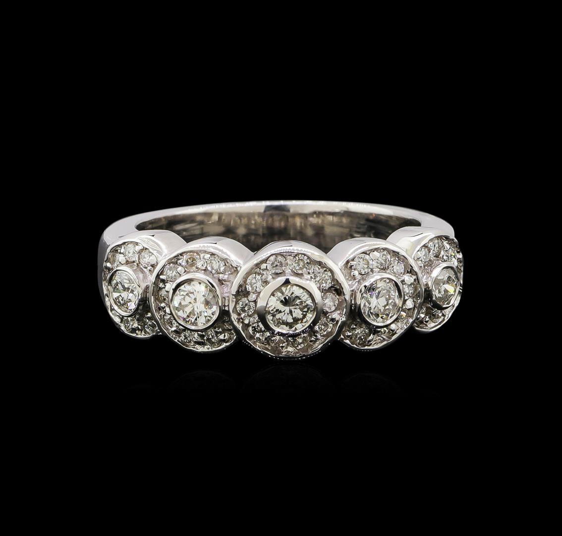 One electronically tested 14KT white gold ladies cast diamond ring with a bright polish finish. Identified with markings of "14K". Condition is new. Containing: Four bezel set round brilliant cut diamonds, measuring 2.50 - 2.50 x 1.50mm (depth est.) approximate total weight of 4 Stones = 0.30 ct. Clarity: SI-2 to I-1. Color: H - I, Cut is Good. Thirty-Nine prong set round brilliant cut diamonds, measuring 1.30 - 1.30 x 0.78mm (depth est.) approximate total weight of 39 Stones = 0.37ct. Clarity: I-1 to I-2. Color: I - J, Cut is Good. Diamonds are graded in the mounting, unless otherwise stated. Total Weight of Diamonds 0.67ct. Total Weight of Ring 5.70 grams. GGL Appraised.