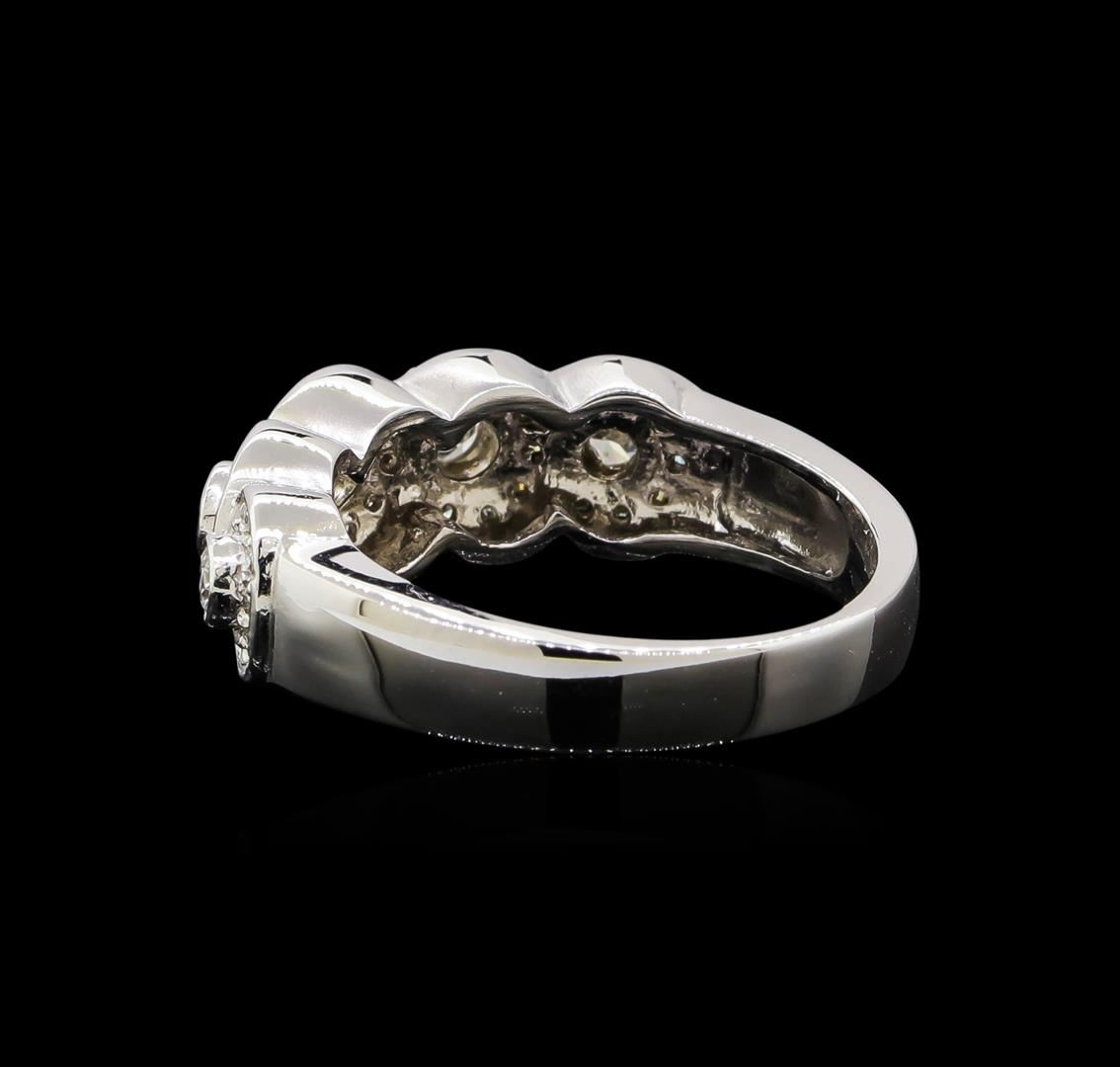 One electronically tested 14KT white gold ladies cast diamond ring with a bright polish finish. Identified with markings of "14K". Condition is new. Containing: Four bezel set round brilliant cut diamonds, measuring 2.50 - 2.50 x 1.50mm (depth est.) approximate total weight of 4 Stones = 0.30 ct. Clarity: SI-2 to I-1. Color: H - I, Cut is Good. Thirty-Nine prong set round brilliant cut diamonds, measuring 1.30 - 1.30 x 0.78mm (depth est.) approximate total weight of 39 Stones = 0.37ct. Clarity: I-1 to I-2. Color: I - J, Cut is Good. Diamonds are graded in the mounting, unless otherwise stated. Total Weight of Diamonds 0.67ct. Total Weight of Ring 5.70 grams. GGL Appraised.