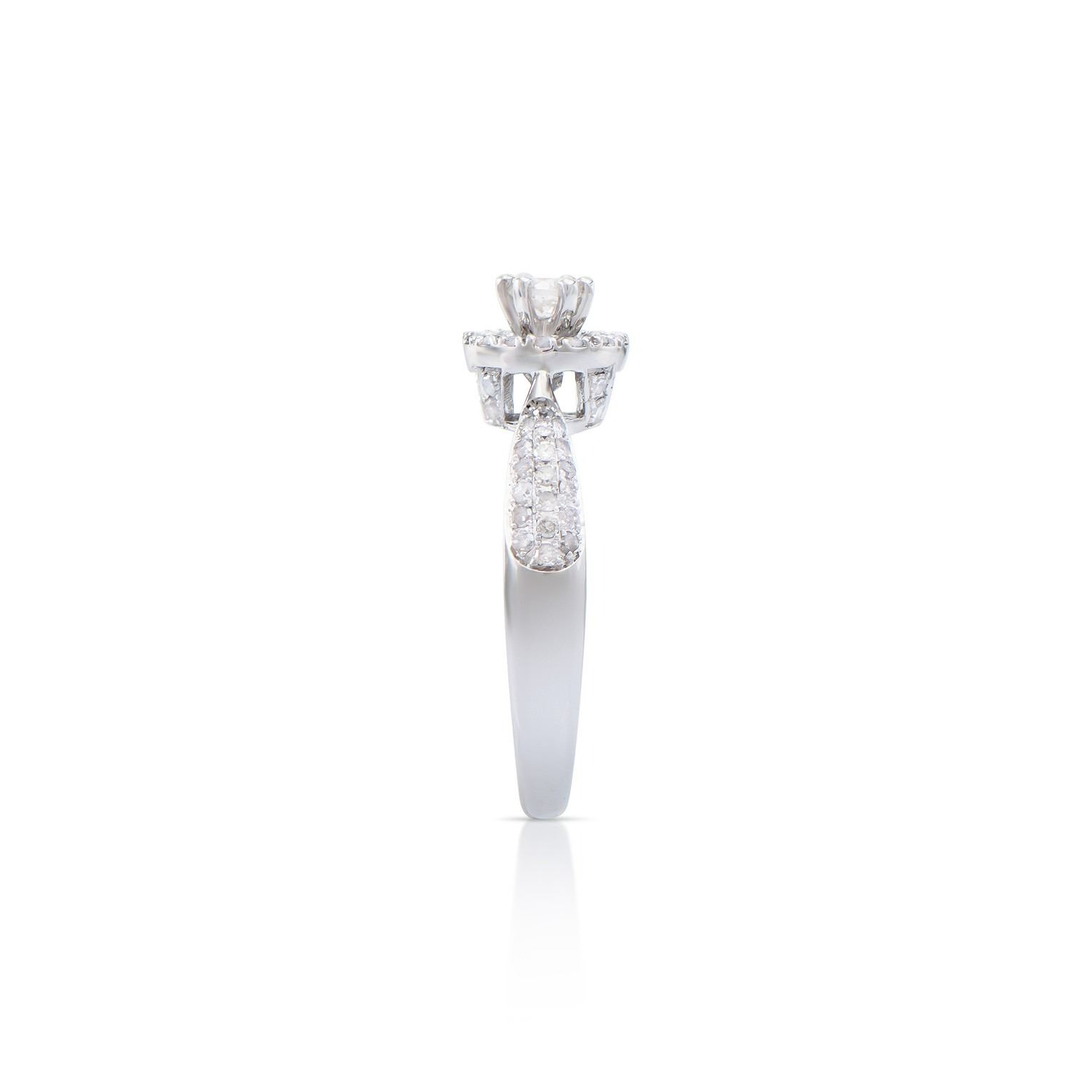 (1) round Diamond with a total weight of 0.22cts with a color of H-I and clarity of I1-I2. (60) round Diamonds with a total weight of 0.45cts with a color of H-I and clarity of I1-I2. Total weight of this ring is 3.7 grams. Ring size is 7.5.