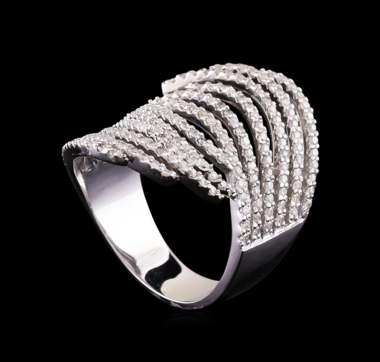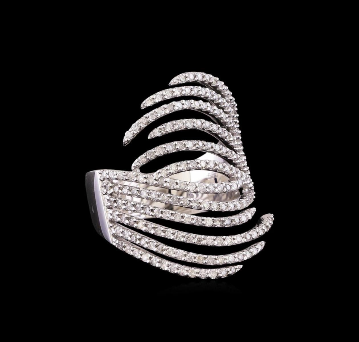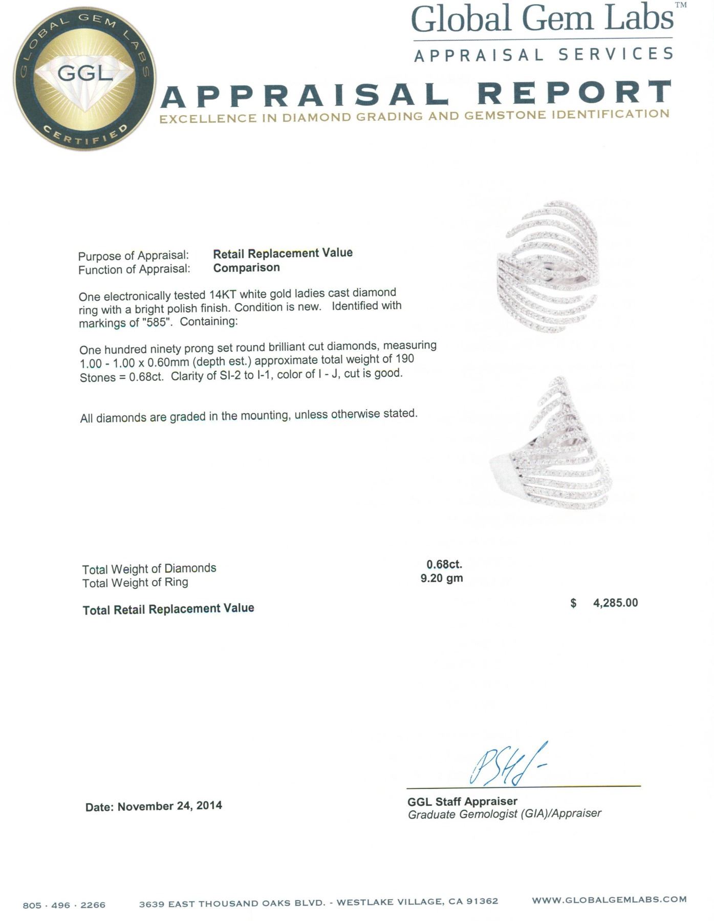 One electronically tested 14KT white gold ladies cast diamond ring with a bright polish finish. Identified with markings of "585". Condition is new. Containing: One Hundred Ninety prong set round brilliant cut diamonds, measuring 1.00 - 1.00 x 0.60mm (depth est.) approximate total weight of 190 Stones = 0.68ct. Clarity: SI-2 to I-1. Color: I - J, Cut is Good. All diamonds are graded in the mounting, unless otherwise stated. Total Weight of Diamonds 0.68ct. Total Weight of Ring 9.20 grams. GGL Appraised.