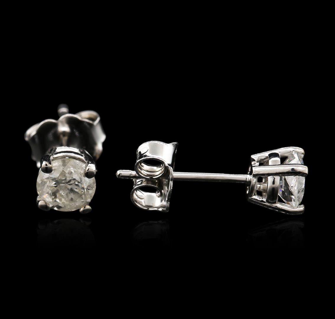 One pair electronically tested 14KT white gold ladies cast diamond stud earrings with friction posts with a bright polish finish. Identified with markings of "14K". Condition is new. Containing: Two prong set round brilliant cut diamonds, measuring 4.52 - 4.52 x 2.72mm (depth est.) approximate total weight of 2 Stones = 0.68ct. Clarity: I-3. Color: I, Cut is Good. Diamonds are graded in the mounting, unless otherwise stated. Total Weight of Diamonds 0.68ct. Total Weight of Stud Earrings 0.90 grams. GGL Appraised at $950.00.